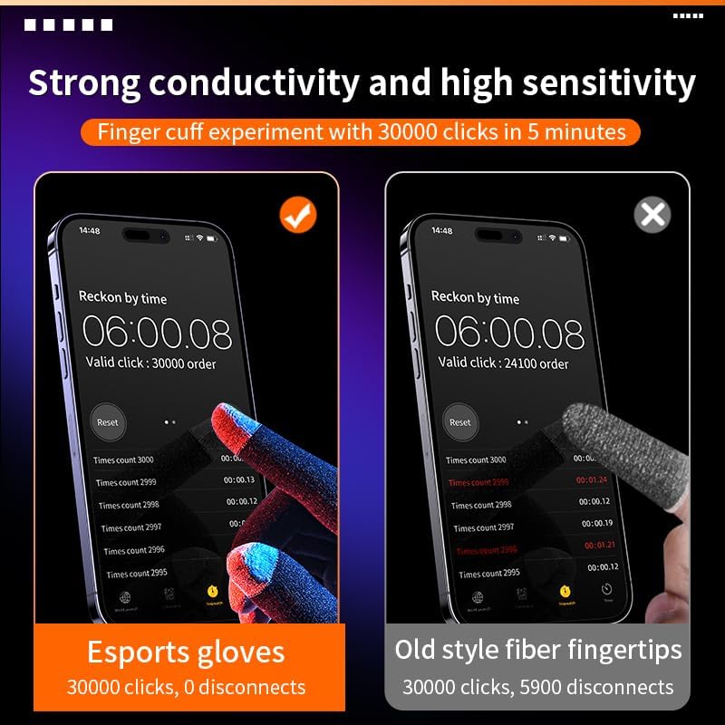 ✋ MATERIAL QUALITY: The finger part is made of top-quality silver fiber, which is super conductive and sensitive, and the fingertips have an eSports experience. Not only reduces the friction on the screen,allowing you to enter an impressive smooth gaming experience and reduce gaming errors.