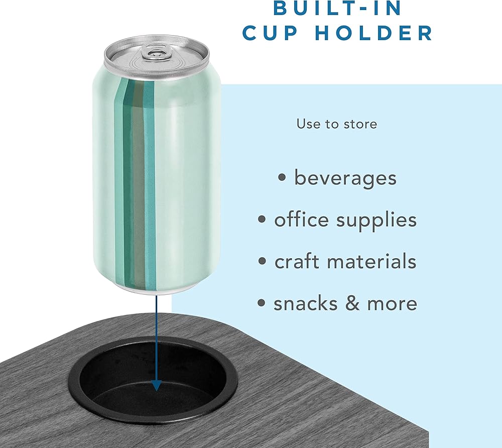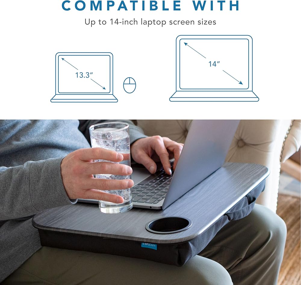 Features: The ergonomically curved front edge makes your lap desk easy to use. The cup holder is three inches in diameter and an inch deep, ideal for most standard cups and glasses. The integrated device ledge keeps your computer and papers from sliding.