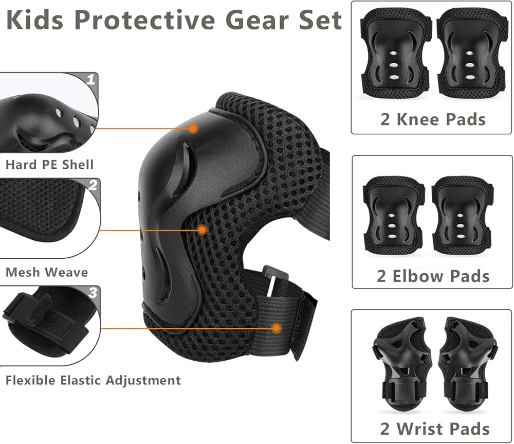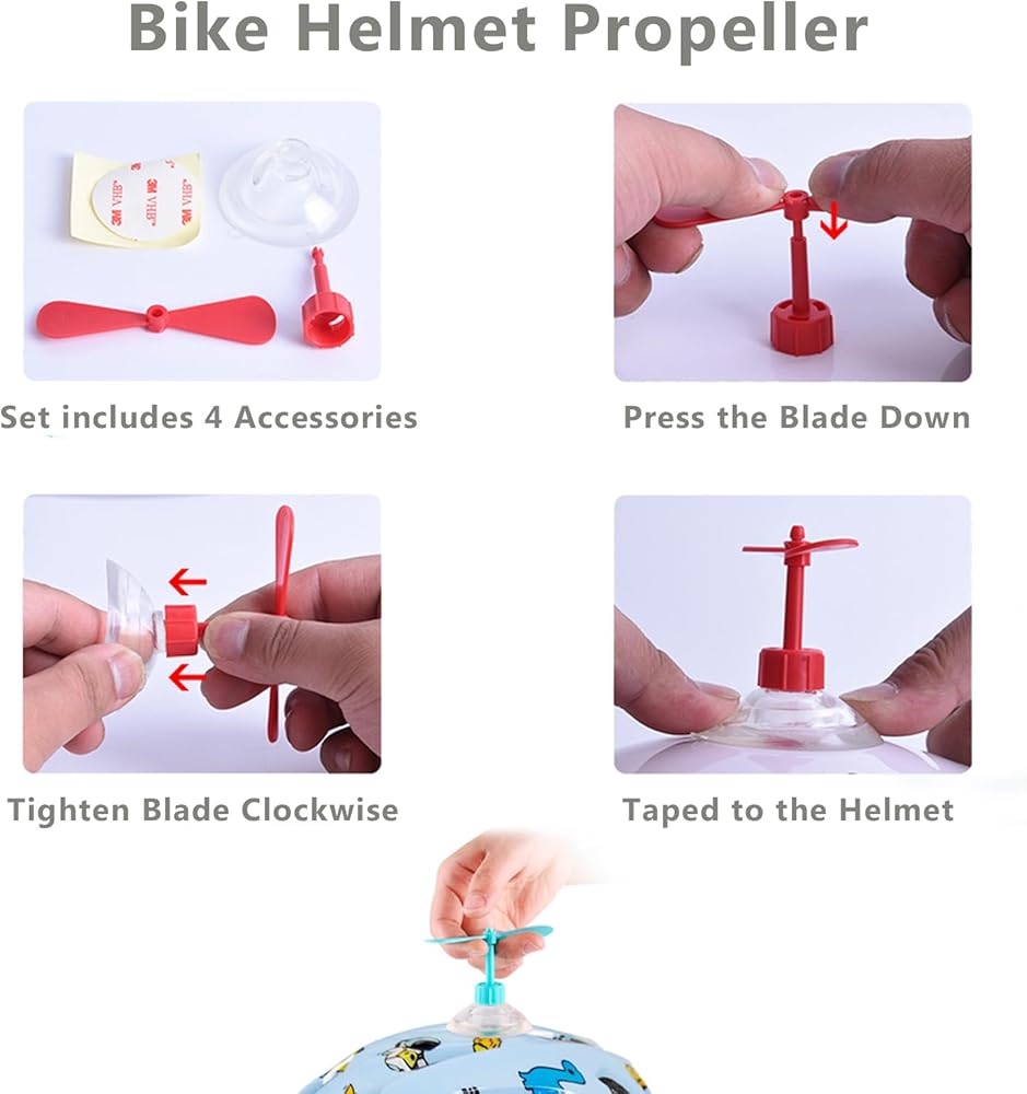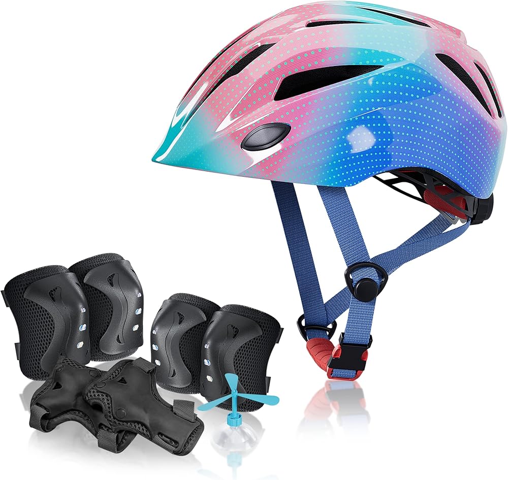 WHAT YOU GET - Kids protective gear including 1*Bike Helmet, 2*Elbow Pad, 2*Knee Pad, 2*WRIST PAD,1*Helmet Propeller. Perfectly fits for all sizes and long.Helmet propeller makes riding fun for kids. If you have any questions about our kids bike helmet, please let us know, we will help you until the problem is solved.