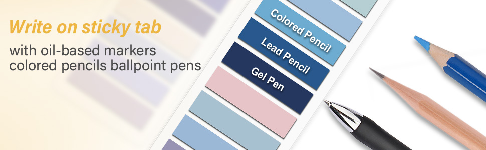 ♻【Non-toxic Material】These book tabs for binders made of high quality PET material and special adhesive, waterproof, non-toxic, no odor, smooth writing. The self adhesive part is transparent so you can still read what's written under them.