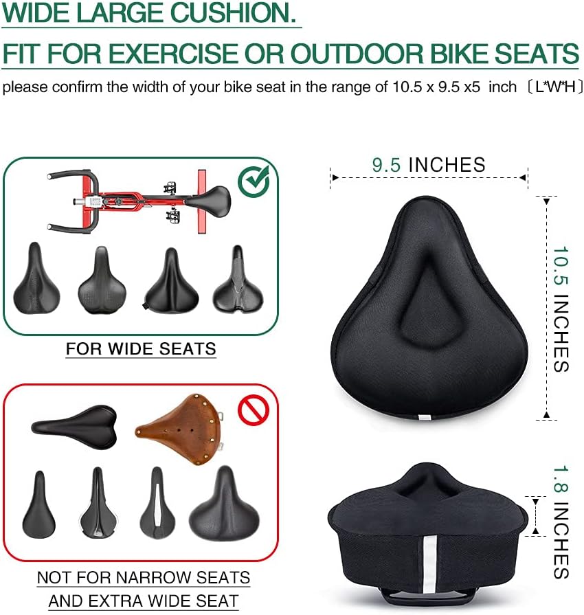 【One Size Fits Most】Wide bike gel seat cover is 10.5 x 9.5 x 2 inches (L*W*H). Fits for bike seat which is in the range of 11 x 10 x 5 inches. Suitable for spin class, cruiser, stationary bikes, indoor exercise bikes, and also for outdoor bike seat. Please measure before you buy. It will NOT FIT OVERSIZE BIKE SEATS.