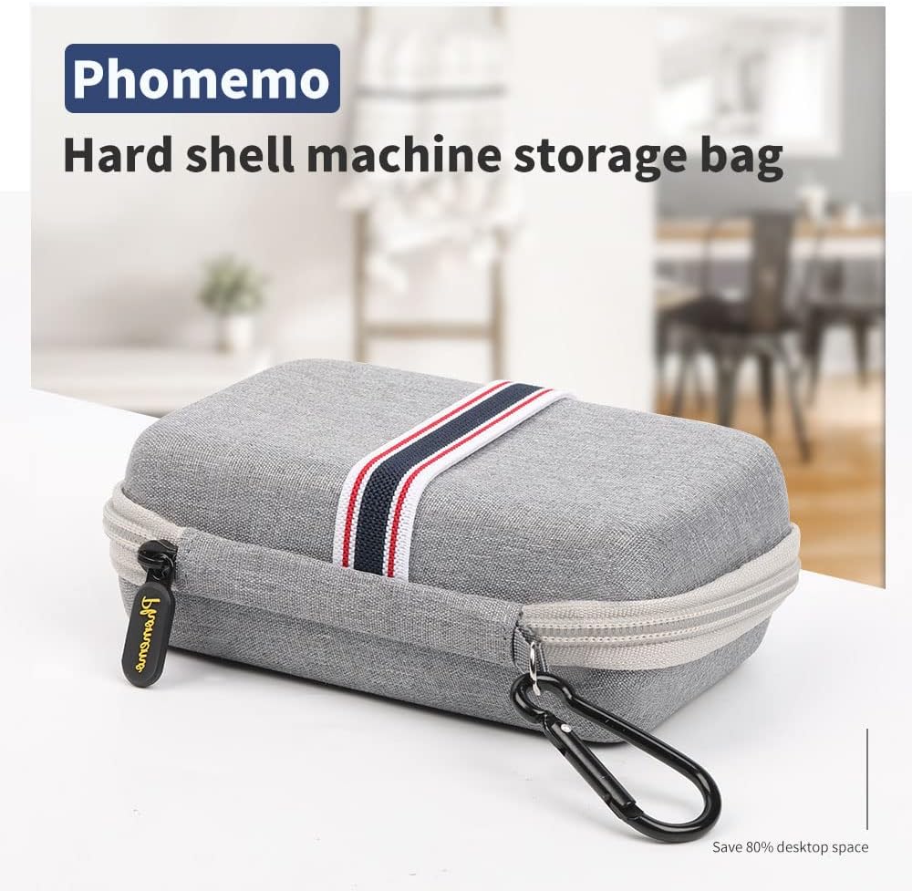 [Storage bag size]- 100mm*150mm*60mm, can accommodate a printer and a small amount of paper rolls and an USB cable. Phomemo Mini Hard Shell Protection Box is waterproof, dustproof and shockproof. It has a built-in storage compartment and a bumper belt to effectively protect the printer from damage.