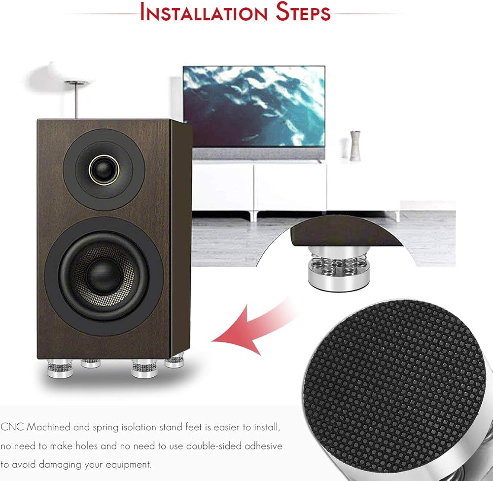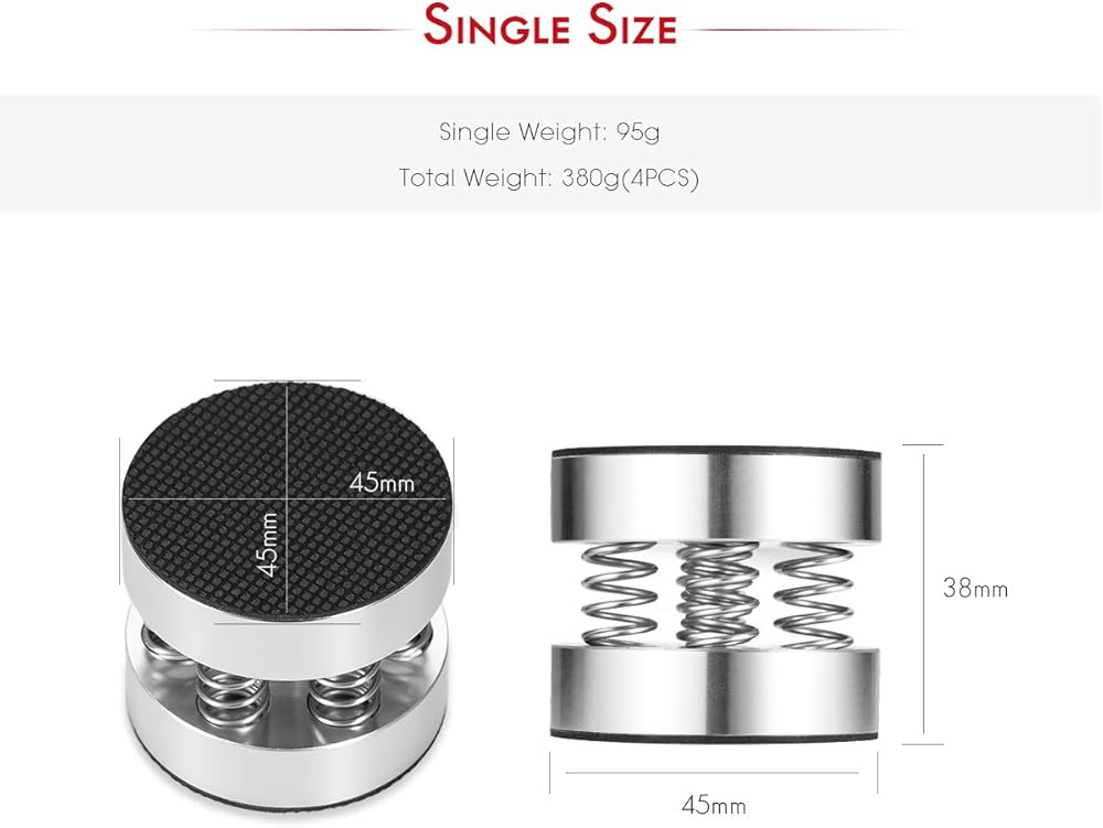 Design: CNC Machined and spring isolation stand feet is easier to install, no need to make holes and no need to use double-sided adhesive to avoid damaging your equipment. Espeically it's convenient for you to adjust load bearing by moving or adding springs which can make sound feeling different