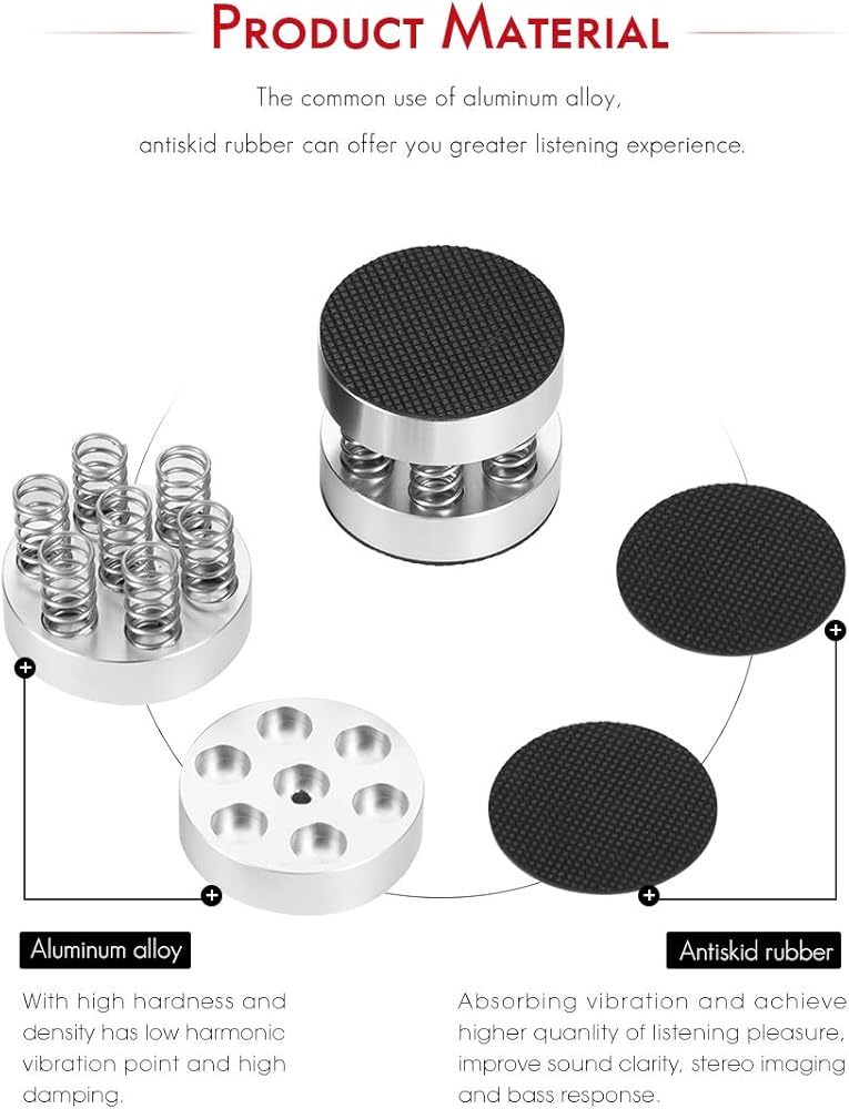 Materials: ① Aluminum alloy: with high hardness and density has low harmonic vibration point and high damping; ② Antiskid rubber: absorbing vibration and achieve higher quanlity of listening pleasure, improve sound clarity, stereo imaging and bass response