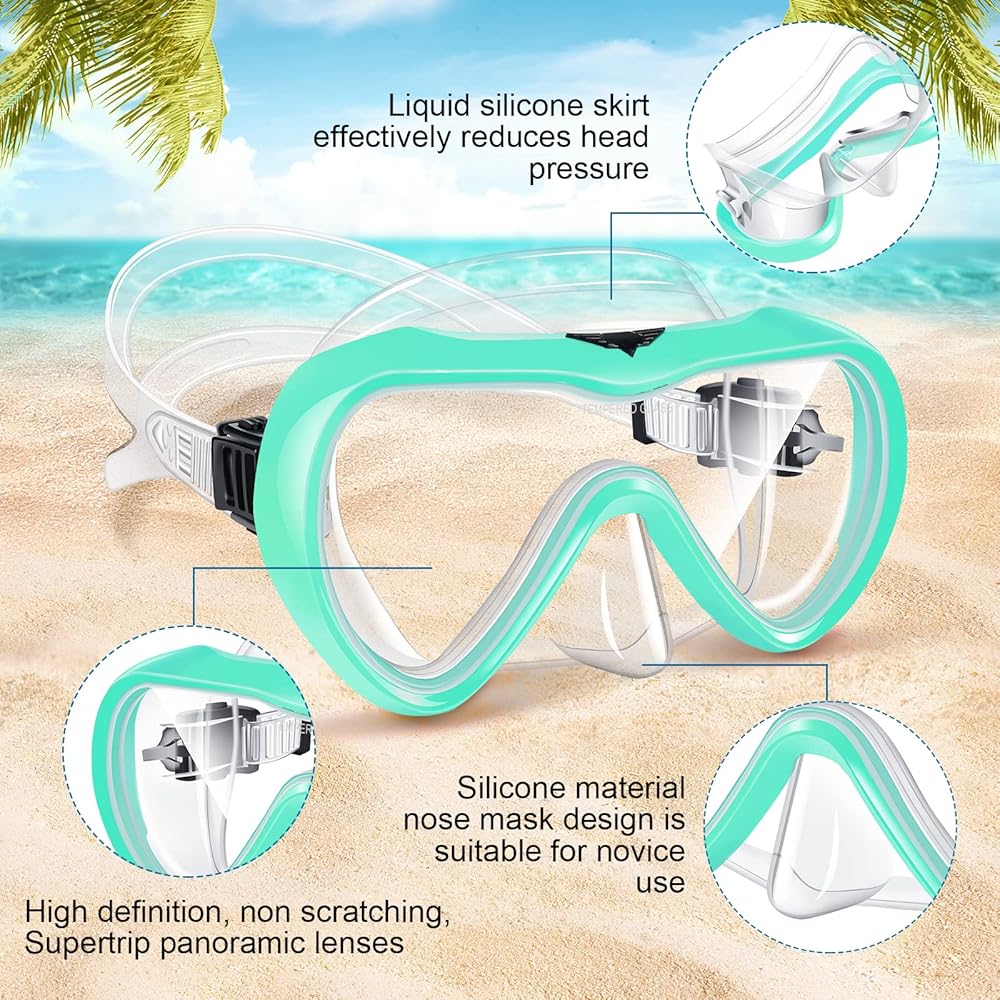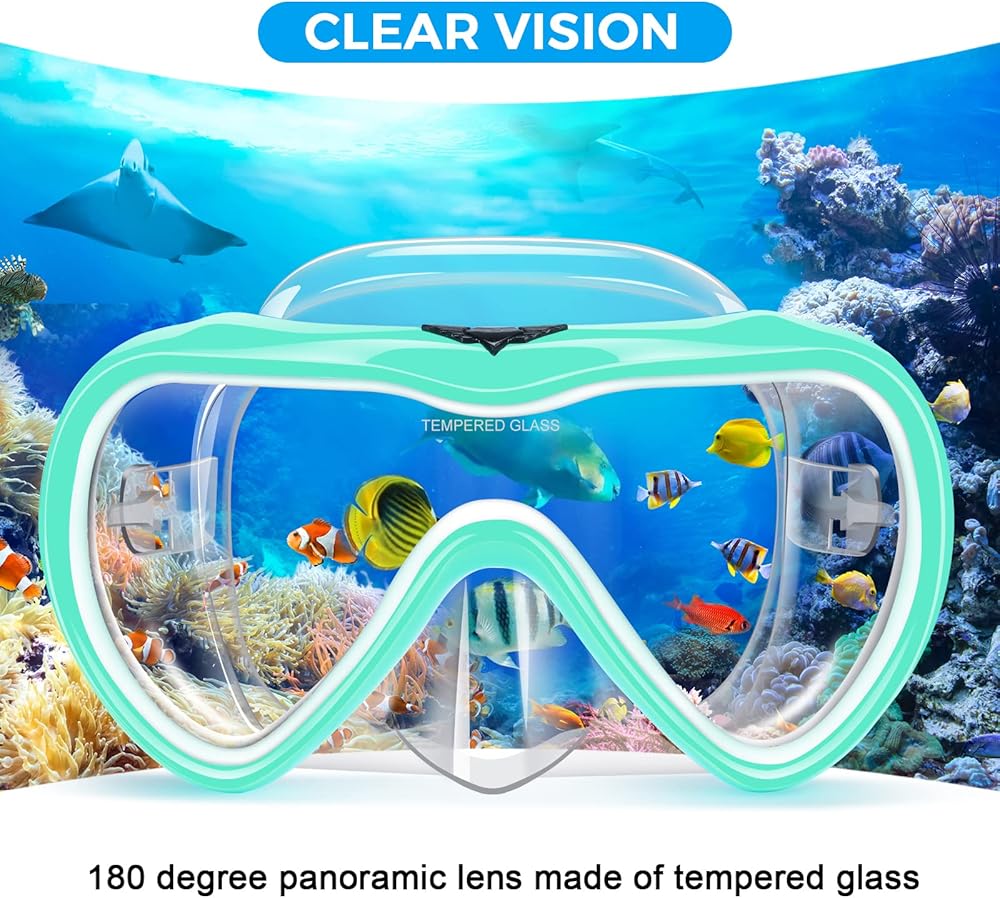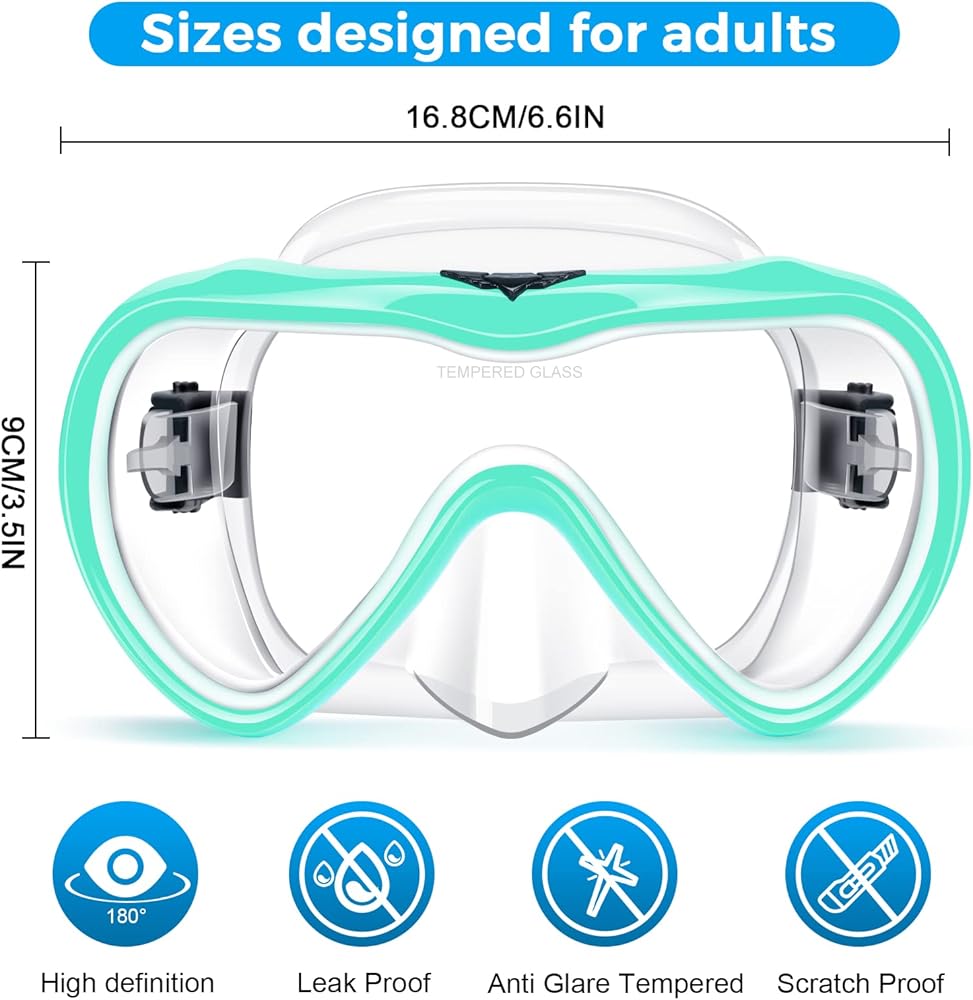 【Tempered Glass Lens for Safety】 Our snorkel mask lens is made from tempered glass with a good impact resistance, which scratch-resistant and shatter-resistant. Tempered glass lens helps you withstand the pressure of the deep sea and protects you from harm. NOTICE:DO NOT JUMP INTO WATER WITH WEARING THE DIVING MASK.
