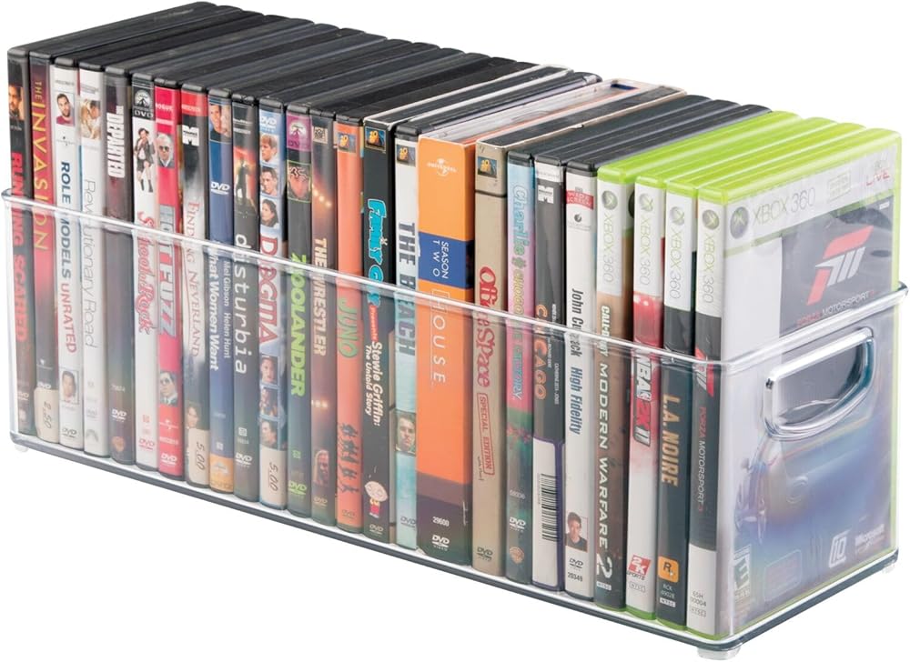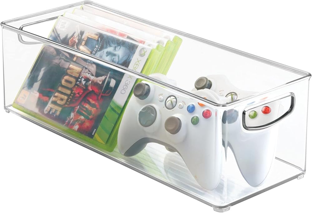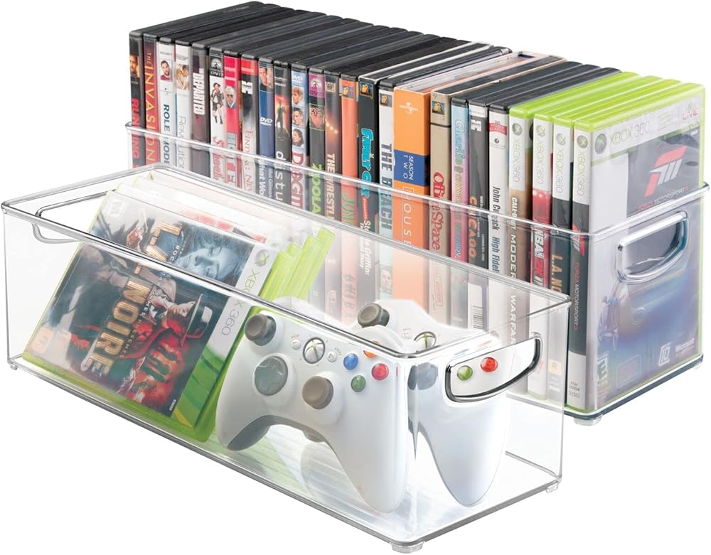 Take the clutter out of media consoles, cabinets, and closets with this Household Storage Bin from mDesign. This storage holder bin makes it easy to organize all your DVDs, video games, and gaming accessories in one convenient place. The open-top design lets you see what's stored inside and grab what you need right when you need it without the hassle. Built-in handles allow you to move the bin on and off shelves as needed. Use these bins together to create custom stackable, vertical storage and maximize your space in small or crowded cabinets and closets. modern living by Design.