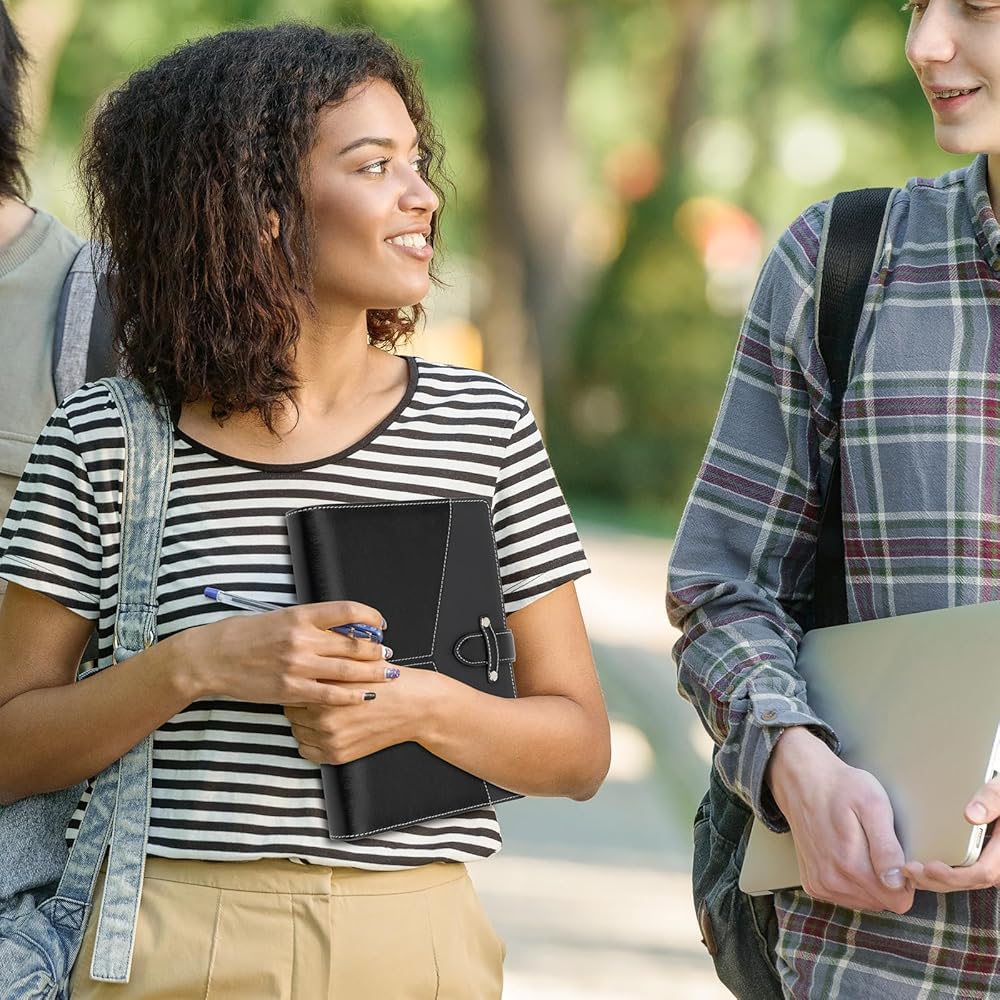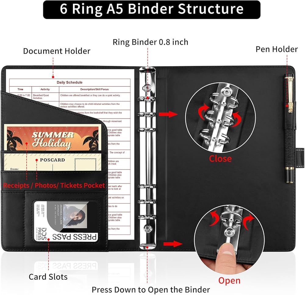 【Premium Material】High quality vegan leather offering long-term durability. Smooth, textured surface,reinforced stitching and easy to clean. 6 Ring A5 Binder structured with a buckle closure provides you more privacy.