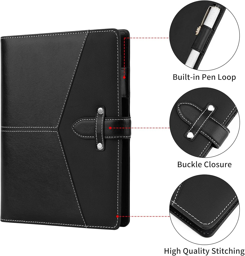 【Keep Organized】Pechor A5 business padfolio with multiple compartments----Left side: 1 clear card slot, 2 receipts/ stickers pockets, 1 document sleeve; Right side: Pen holder and 6 ring binder. Multiple layers make it easy to organize your supplies.