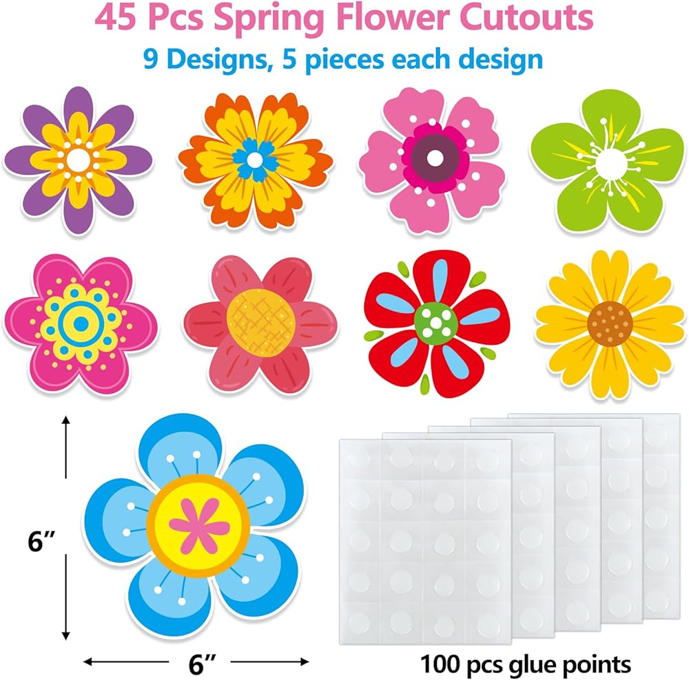 ✅ WHAT YOU GET. 45pcs flower cutouts in 9 styles and 100 glue points. 6”Cardboard. Great for Spring party, flower themed party, tea party, add vibrant atmosphere for your party.