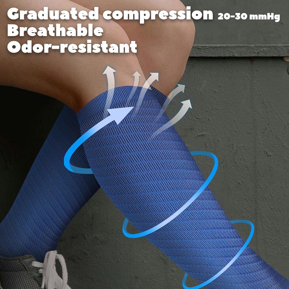 Graduated Compression for Enhanced Performance: These men women compression socks feature a 20-30 mmHg graduated compression, providing targeted support to your legs. Whether you're engaged in sports, running, fitness activities, or feeling uncomfortable with various problems in feet and legs, the compression helps improve blood circulation and reduce muscle fatigue, enhancing overall performance.