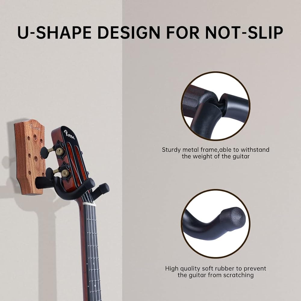 Unique U-Shaped Design Guitar Wall Mount: Different from the flat shape guitar holder, Rosen guitar wall hanger has a U-shape cradle, which could securely fix your instrument firmly without the risk of sliding. The length of this hook bracket can prevent the guitar from rubbing against the wall to prevent the guitar from wearing. It works for Acoustic Electric Bass Guitar 6-String Guitar Mandolin Banjo.