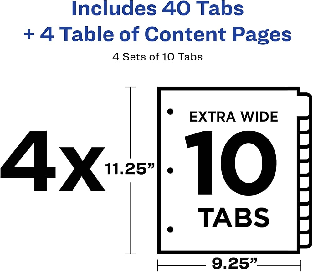 Give yourself a little extra space with Avery 11165 Extra-Wide Ready Index Dividers with customizable table of contents. The extra-wide dividers measure 9-1/4" x 11" so that your tabs won't get hidden behind sheet protectors. Each pack includes a printable table of contents page that can be customized with free templates and designs by visiting the Avery site. Each side of the table of contents page features a different orientation so that you print in either portrait or landscape. Both the table of contents and the divider tabs are pre-printed and color-coded. Designed to be tear-resistant, the edges of each divider are laminated with a clear border on both sides to reinforce the pre-punched binder holes so that they can withstand repeated page flipping and use. 1 set of 10 dividers are included and 1 table of contents page. Whether you are a student organizing class notes, an office admin archiving files, a teacher keeping track of graded homework or a parent storing bills and other important documents, Avery dividers are the perfect way to organize your life in style.