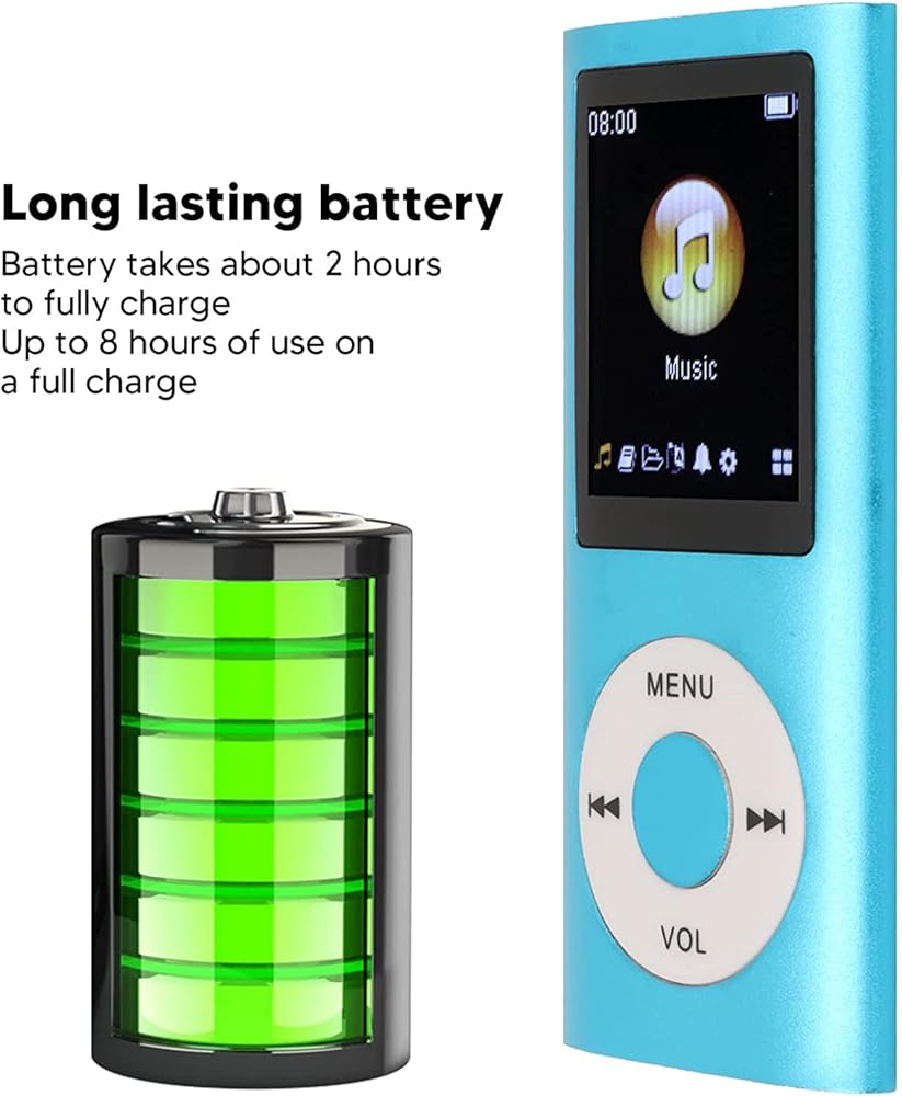 LONG TIME PLAYBACK - Enjoy your music for extended periods with the MP3 player's long battery life. When fully charged, it can provide up to 8 hours of playback time, allowing you to immerse yourself in your favorite tunes without worrying about running out of power. The battery takes approximately 2 hours to fully charge.