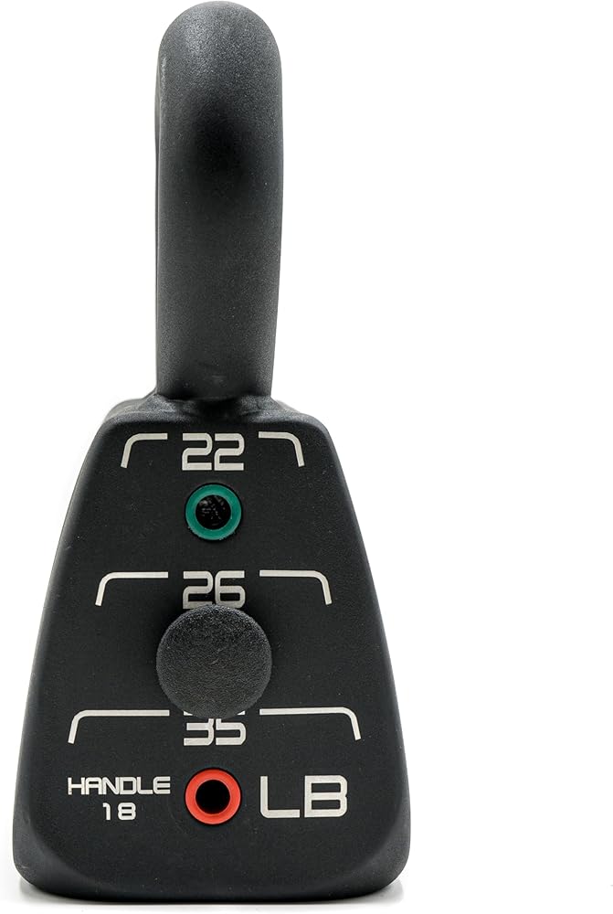 The most ergonomic and compact adjustable kettlebell. The compact contoured shell provides exceptional comfort throughout your entire kettlebell circuit. Save space and money with this versatile addition to your home or commercial gym. Feels like a solid iron Kettlebell with the advantages of adjustability: replaces 4 Kettlebells in the space of 1. Steel Selection Pin with Magnetic Lock. Increments include 18, 22, 26 and 35 lbs. Dimensions: 4.25"W x 5.75"L x 10"H. Handle diameter 1.29".