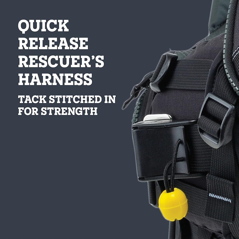 Quick release harness: Clamshell front pocket with multiple compartments and rope storage pockets; Quick release rescuer's harness tack stitched in; Reflective accents for extra visibility