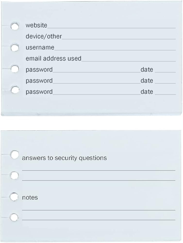 NEW and IMPROVED slightly smaller page includes space for the username, expanded space for longer passwords, email address, as well as spaces for subsequent password changes and effective dates.