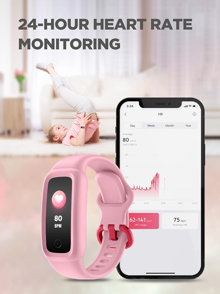 [ALL-DAY ACTIVITY TRACKING & IP68 SWIMMING WATERPROOF] This 24-hour activity tracker automatically counts your children's steps, distance, and calories burned and activity minutes. It supports 10+ activity modes: Walking, Running, Cycling, Dancing, Basketball, Football, Tennis, Climbing, Workout, and more. It is rated IP68 waterproof so your kids can wear it during water activities and while enjoying pool time.