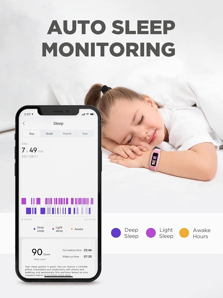 [HEART RATE, SLEEP TRACKING & SILENT ALARM CLOCK] The fitness tracker can automatically monitor your kids' daily real-time heart rate, track how well they sleep at night, and provide data about their sleep trends through the night in the app. The silent alarm clock can wake them up without disturbing others.