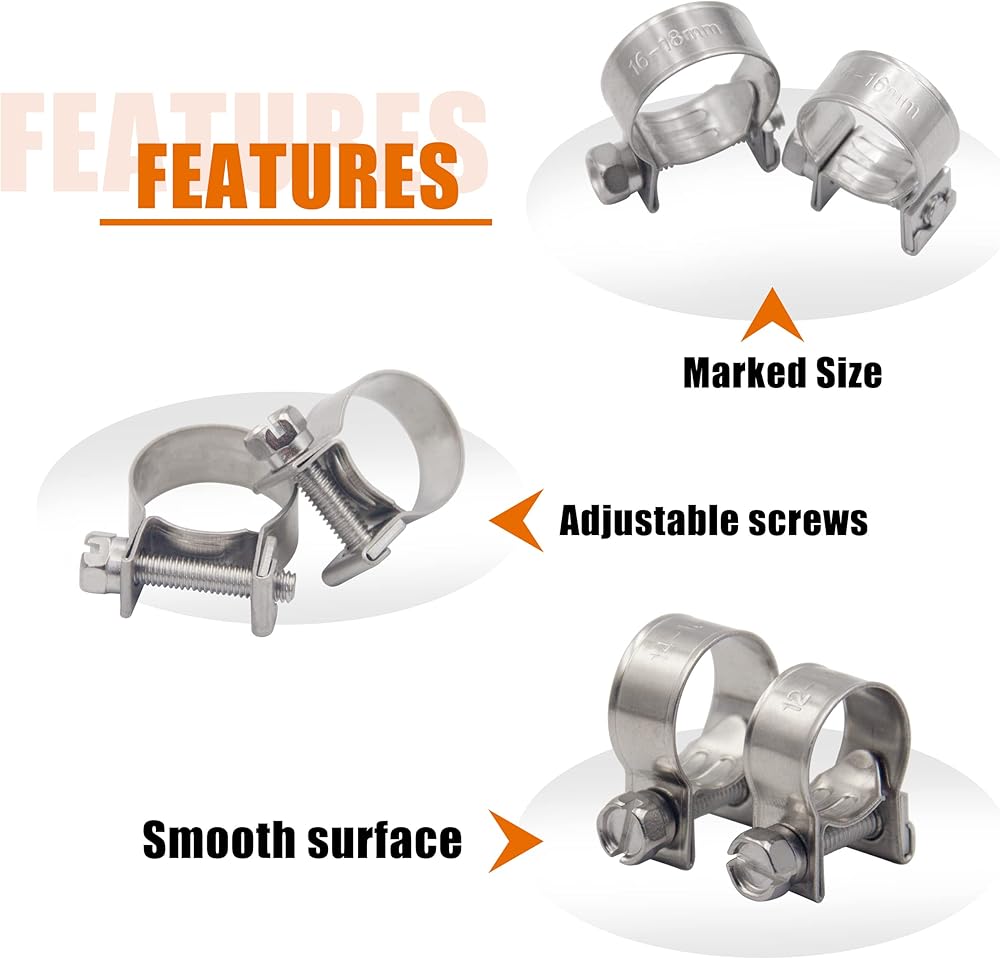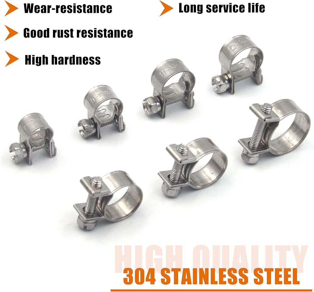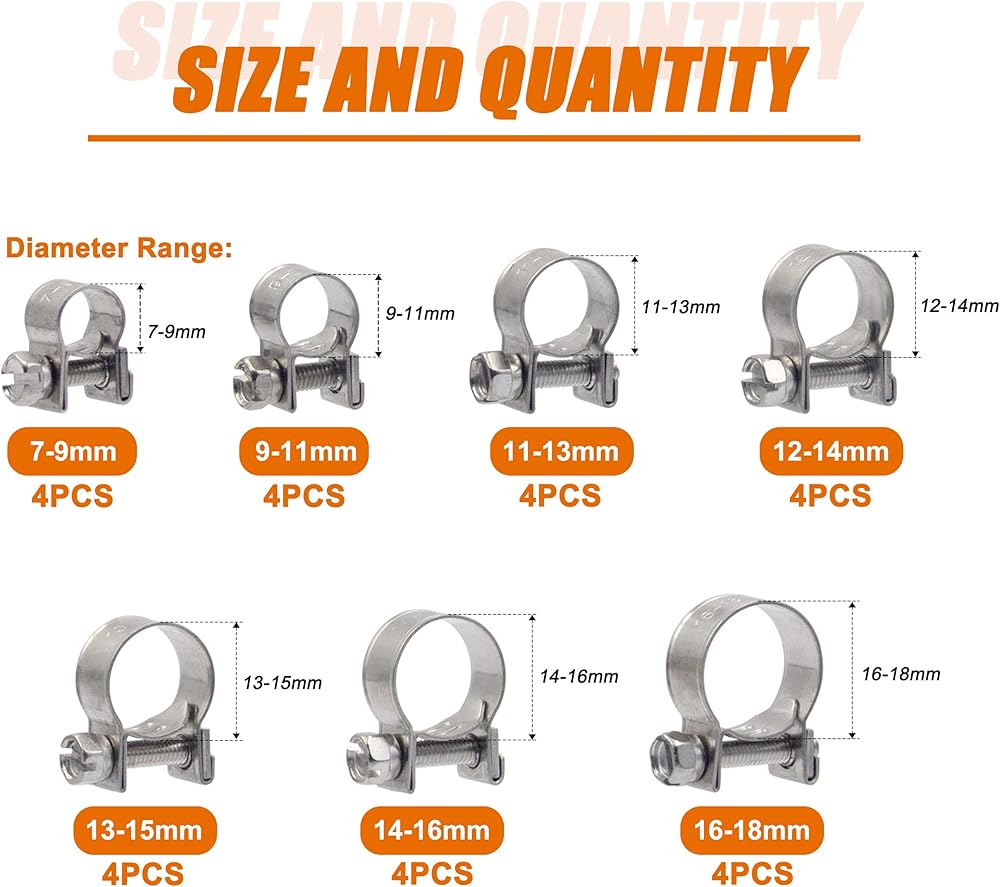 ✅VARIOUS SIZE - This assortment kit has adjustable size range from 7 to 18mm. Fit for Hose Diameter: 7-9mm(4pcs), 9-11mm(4pcs), 11-13mm(4pcs), 12-14mm(4pcs), 13-15mm(4pcs), 14-16mm(4pcs), 16-18mm(4pcs). 7 different sizes can meet your different daily needs.