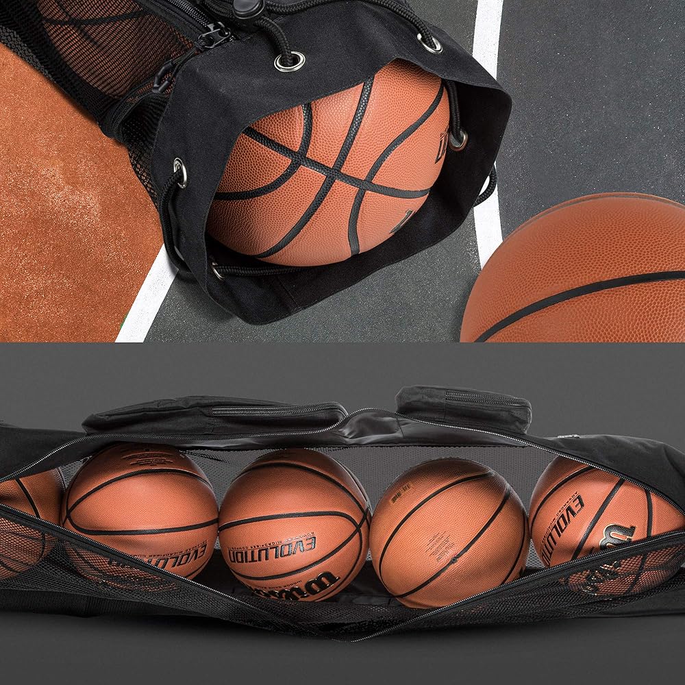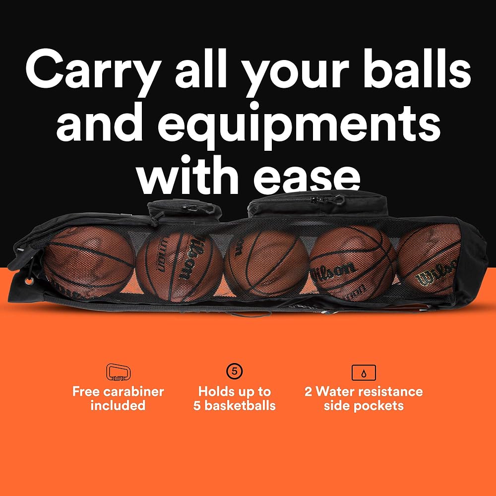 CARRY ALL YOUR BALLS AND EQUIPMENTS WITH EASE - Measuring at 9 inch wide and 45 inch tall, this large mesh ball bag can hold 5 adult size basketballs. The additional SIDE POCKETS are perfect for air pump, stopwatch, whistles and your personal items. The horizontal design helps to retain your balls side by side so it takes less space. It is perfect to transport your gears in the trunk, carry them on a school bus or hang on the wall.