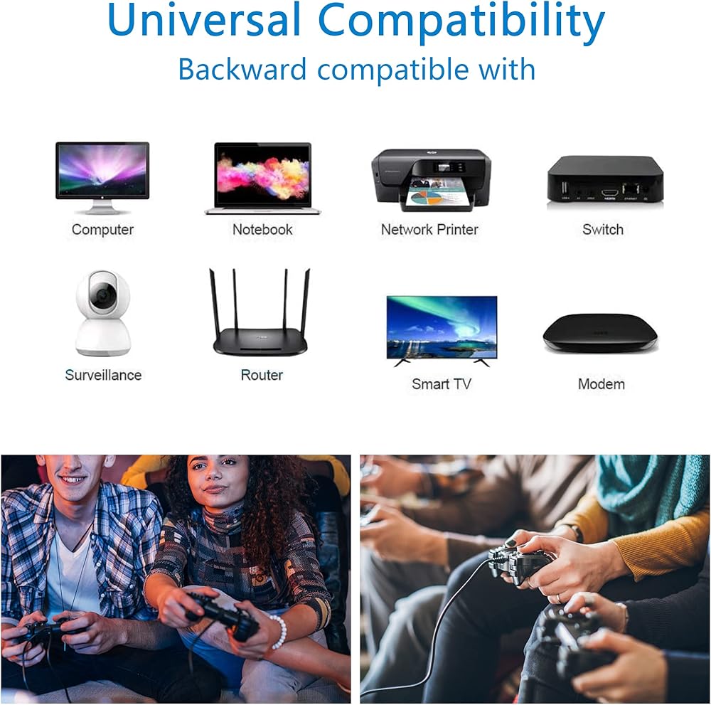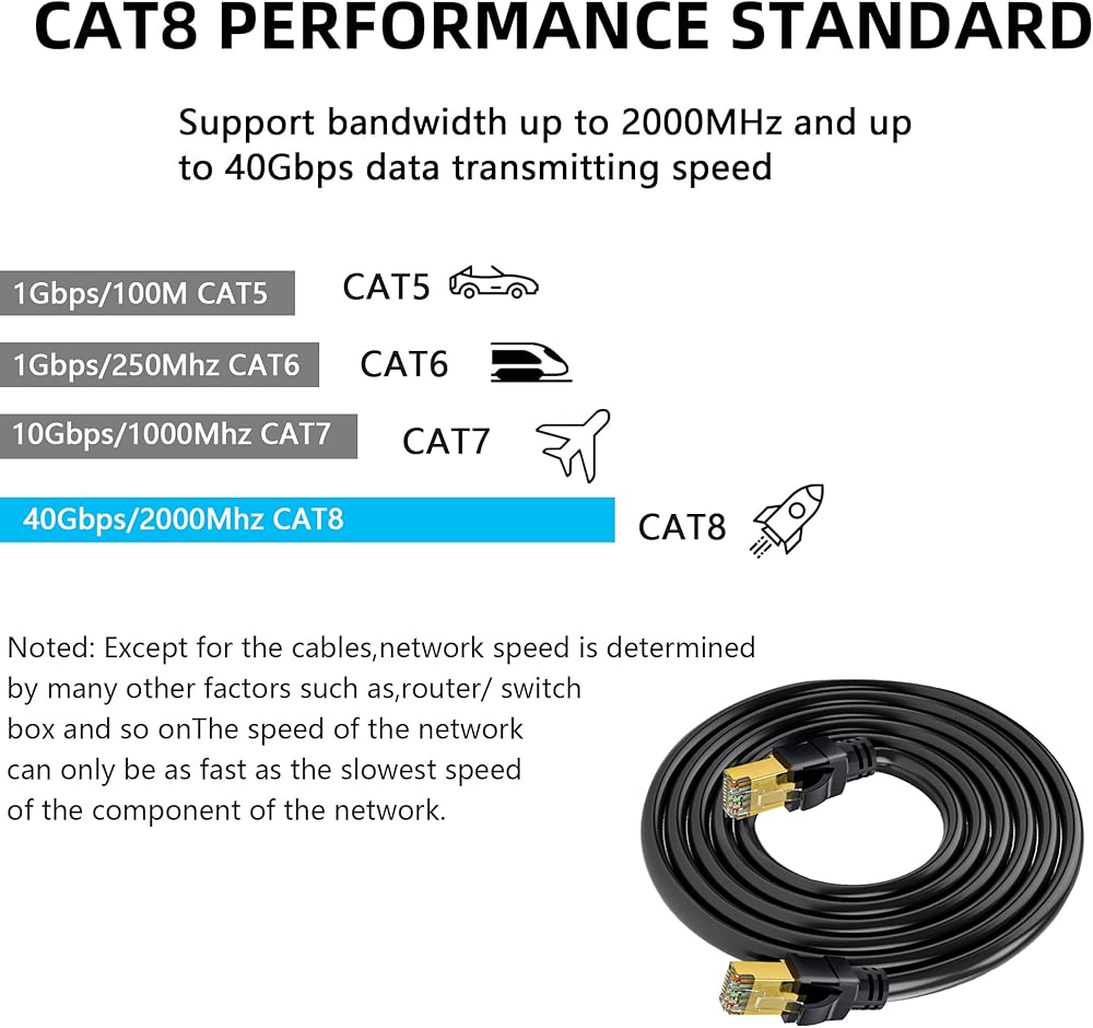 • With Double shielded RJ45 connectors our Cat8 Ethernet cable works perfectly for all the previous(cat5, cat5e, cat6, cat6a and cat7), And with IP Cam, routers, Nintendo switch, ADSL, Adapters, Modem, PS3, PS4, X-box, Patch panel, Servers, Networking Printers, Netgear, NAS, VoIP phones, laptop, Coupler, Hubs, Keystone jack, Smart TV, Imac and other device with RJ45 connectors.