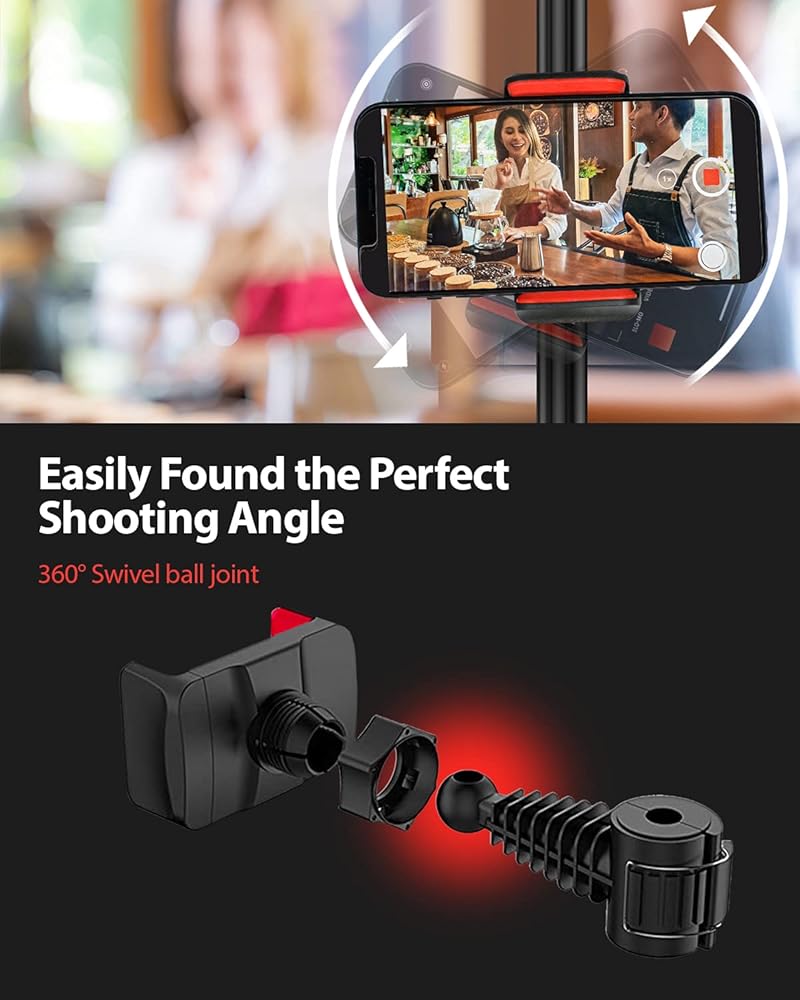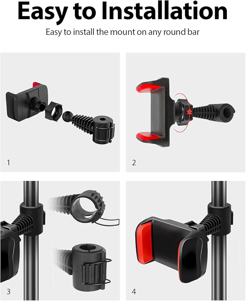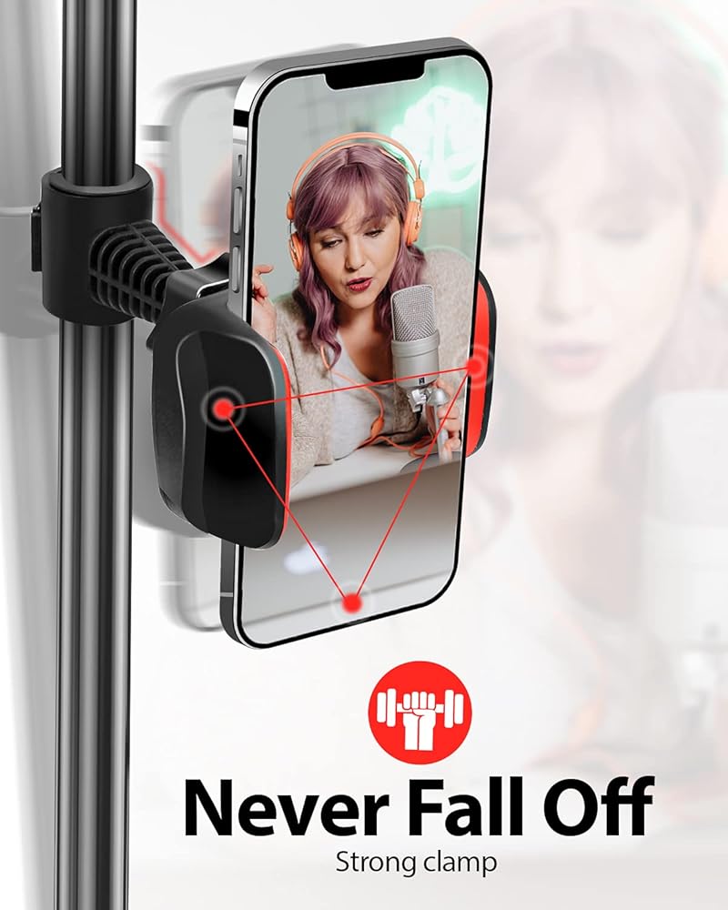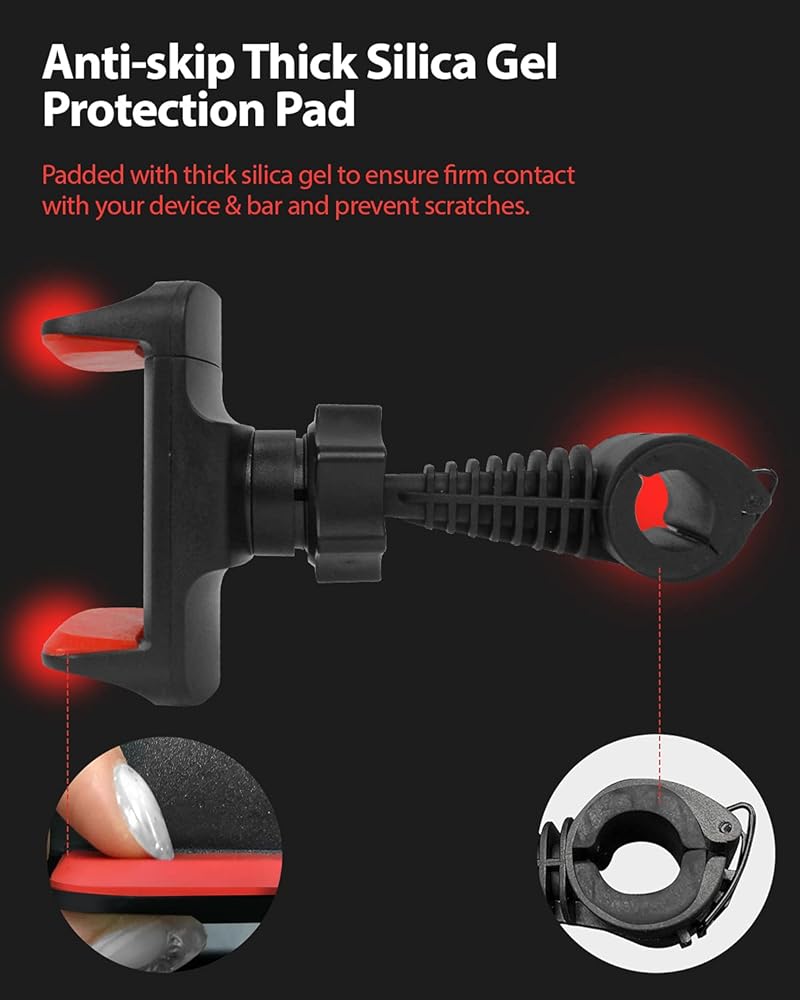 👀👉 Thick Silica Gel Padding- Thick silica gel padding inside the clamp increases friction for greater load capacity and protects the pole against scratches. and the mount head's inner grips are constructed with silica gel pads for securely holding any smartphones 1.75”-3.25” wide.