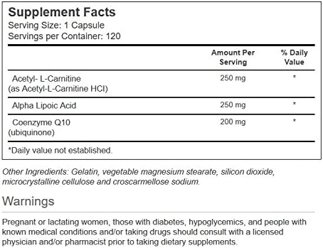 What is Vitacost CoQ10 + Alpha Lipoic Acid + Acetyl L-Carnitine HCl?Vitacost CoQ10 + Alpha Lipoic Acid + Acetyl L-Carnitine HCl is combination formula featuring three antioxidant nutrients that have been shown to promote cardiovascular and cognitive health.*Coenzyme Q10 (CoQ10). CoQ10 is a fat-soluble, vitamin-like compound found in every human cell. Its used by the mitochondria (power plants) of cells to produce energy. CoQ10 is found in highest concentration in cells of organs that require large amounts of energy, such as the heart. It also functions as an antioxidant. While the body produces CoQ10 on its own, levels decline over time, with a steady decrease beginning after age 30. Factors such as aging, genetics, and cholesterol-lowering statins can lead to a CoQ10 deficiency.Alpha lipoic acid (ALA). ALA is a natural compound that functions as a co-factor in vital, energy-producing reactions.* The body produces very little ALA on its own, and it is difficult to obtain sufficient quantities from diet. ALA is well known as a powerful antioxidant.* It has been called a universal antioxidant because it is effective in water-based substances such as blood, while its reduced metabolite, dihydrolipoic acid (DHLA), is effective in fatty tissues and membranes.*Acetyl L-Carnitine (ALC). ALC is the acetyl ester of carnitine, an amino acid derivative, and is distributed throughout the central and peripheral nervous system. Both ALA and ALC are known as mitochondrial antioxidants that can provide anti-aging nutrition.* How does Vitacost CoQ10 + Alpha Lipoic Acid + Acetyl L-Carnitine HCl support health?All three nutrients help provide antioxidant protection against free radical damage.*All three nutrients have been shown to promote cardiovascular and cognitive health.*All three nutrients have been shown to be effective in maintaining blood pressure levels already within the normal range.*ALA enhances the antioxidant activity of vitamins C ...