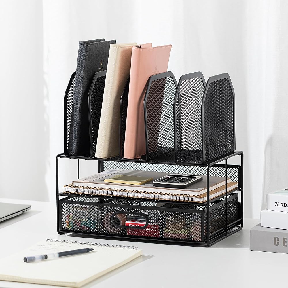 Amazon Basics Mesh Desk Organizer with Sliding Drawer, Double Tray and 5 Upright Sections, Black