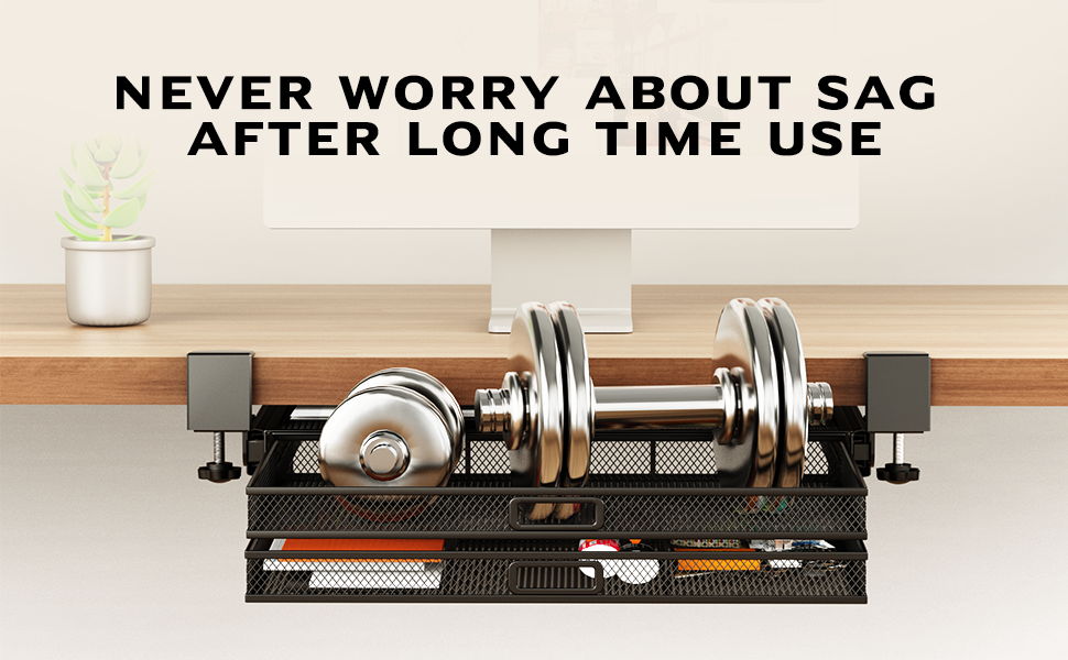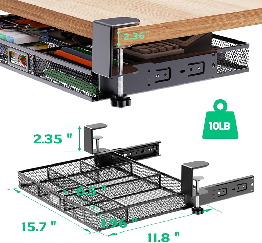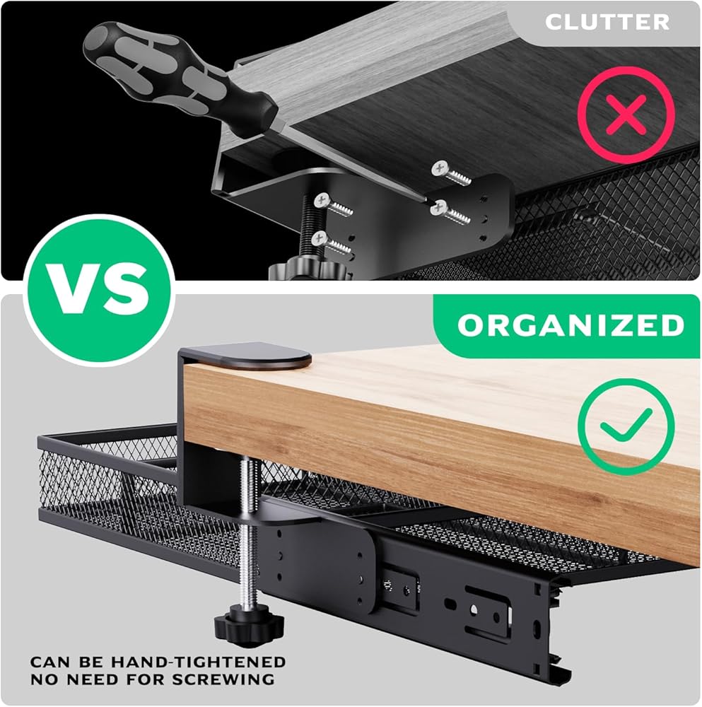 【CLAMP- ON Installation】: Say goodbye to those hassle installation with adhesive strips and drills,our screw-free with clamp-on installation design makes the desk organizers and accessories super easy to install without other tools needed. Take out the desk drawers and align it to the desktop, tighten the screw to complete the installation in minutes. It could aslo be re-attached to new desktop with the removable c-clamp easily. Notice: The maximum thickness of your desk is 2.35".