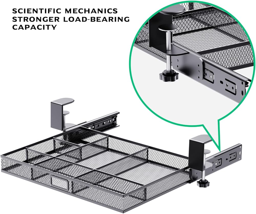 【Super Storage Capacity & Space Saving】: Comes with a 16"*11.8" dual-layer drawer+ 3 separated drawer +sliding rail,this under desk storage offers a super large organized home for all your office supplies such as pens, calculator, scissors, folders, even though the laptop computer. Push the drawer hidden under the desk when not in use which could helps you save more office space on the limited desk. Stay away from cluttered desks and being organized.