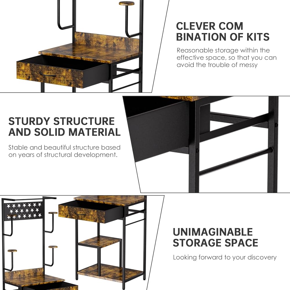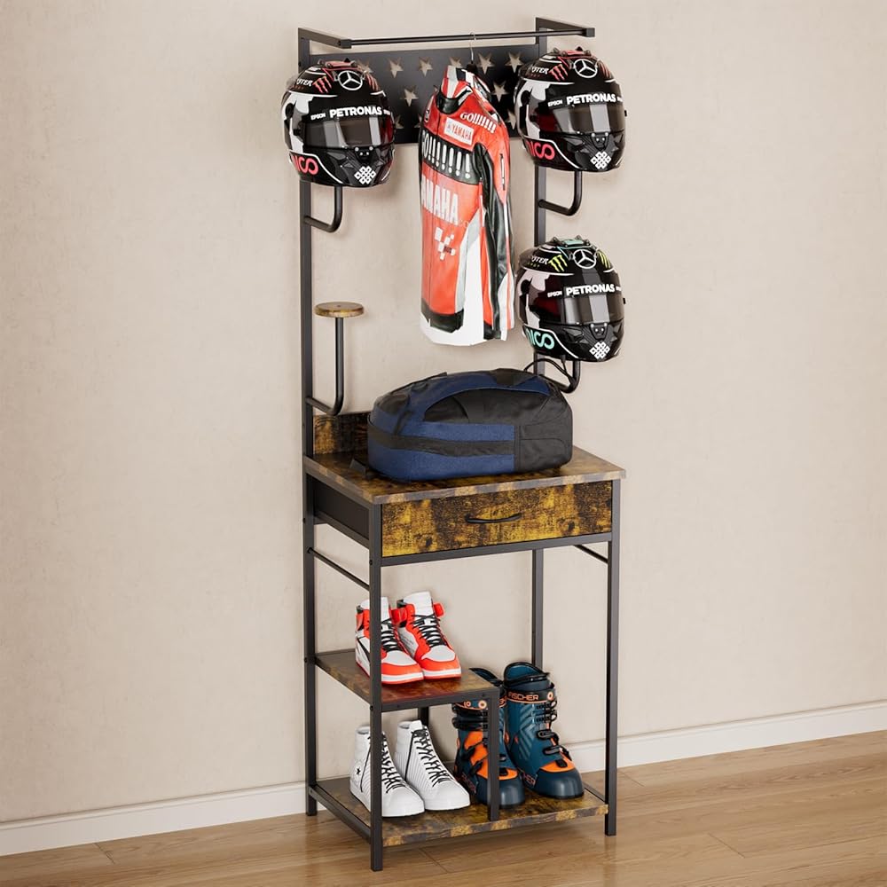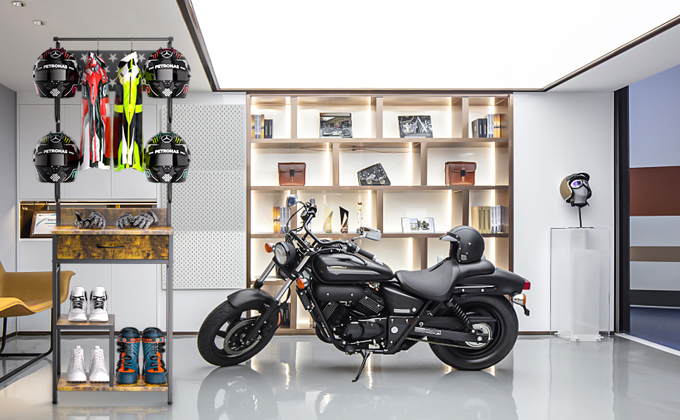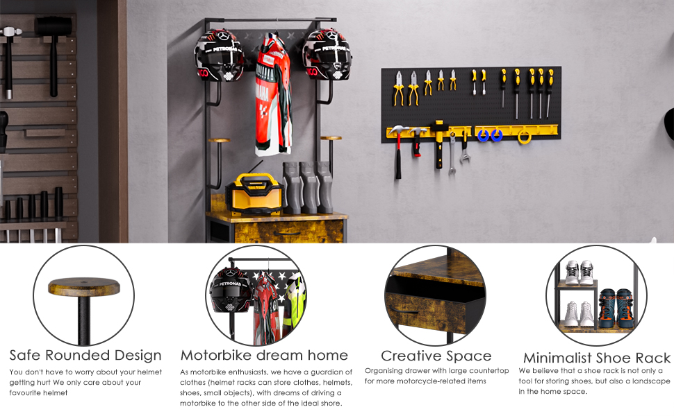 【Motorcycle Helmet Holder Sturdy Durable】motorcycle helmet holder Retrofitting Upgraded Alloy steel S304L. 30% increase in corrosion resistance, plus 50% increase in rust resistance with glossy baking paint, large standing helmet holder is replaced with better materials just to improve the service life and use experience,with drawer motorcycle helmet rack wood and metal construction is sturdy,Looking forward to helmet holder wall mount to bring you a good experience.