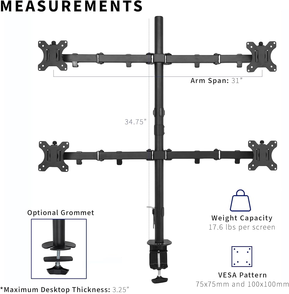 Fits 13" To 30" Screens - Quad monitor mount fitting most screens 13” to 30” in size and up to 17.6 lbs in weight (each) with VESA 75x75mm or 100x100mm hole patterns. Mounts to your desk with heavy duty C-clamp or option grommet fitting desks from 0.4” to 3.3” in thickness.