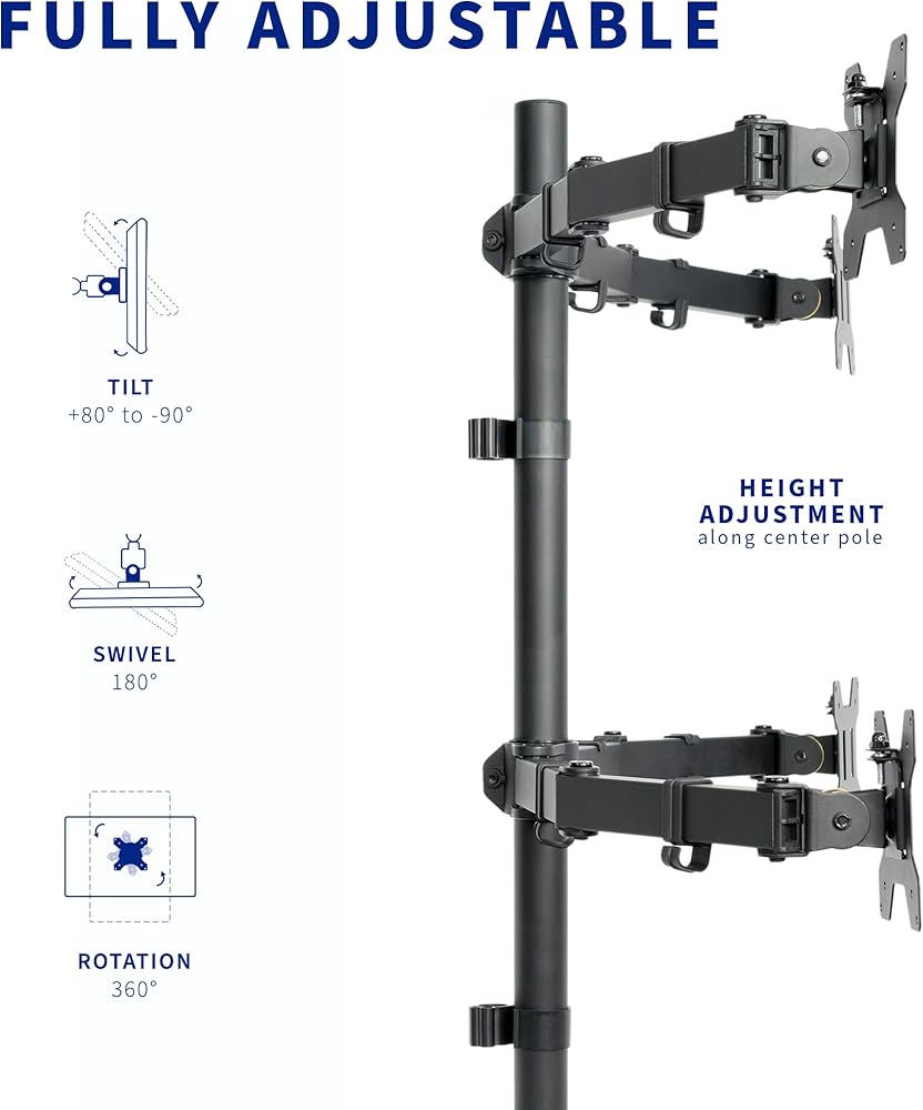 Articulation & Height Adjustment - Enjoy comfortable viewing angles with +80° to -90° tilt, 180° swivel, 360° rotation, and height adjustment along the center pole. Monitors can be placed in portrait or landscape orientation.