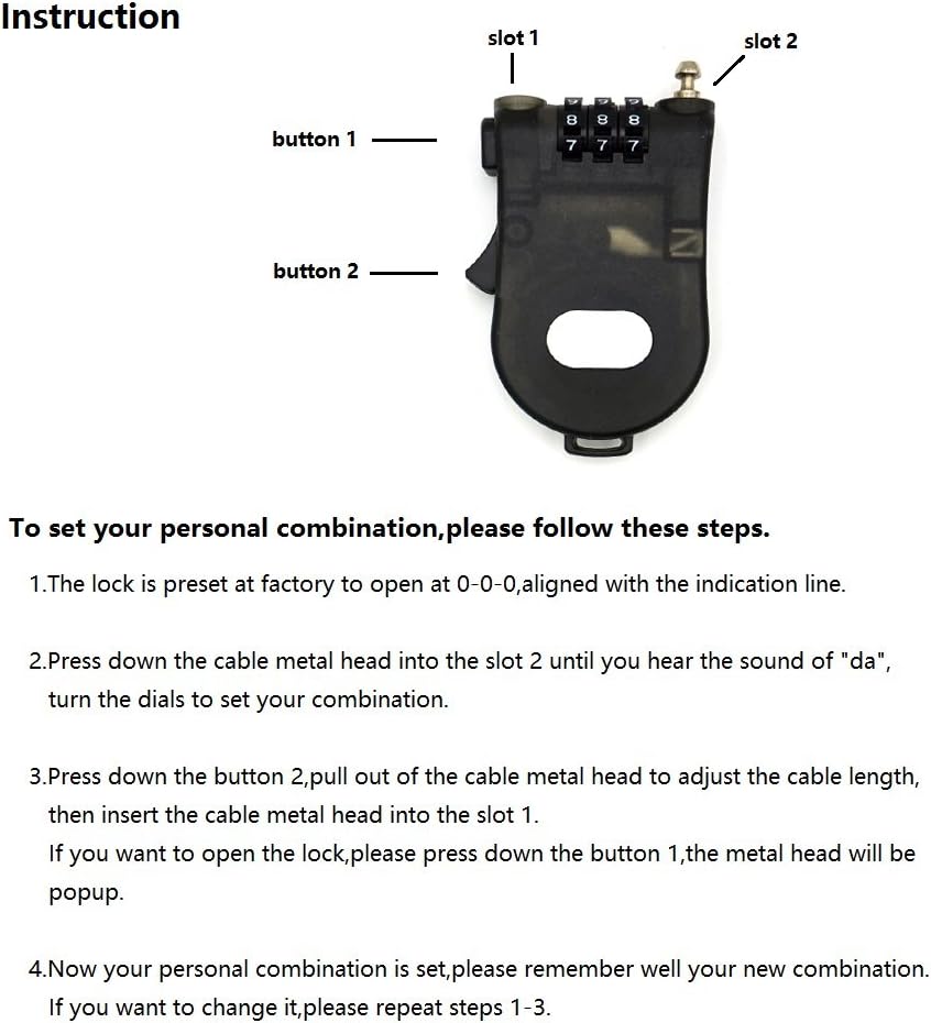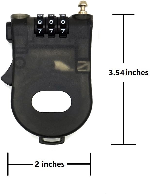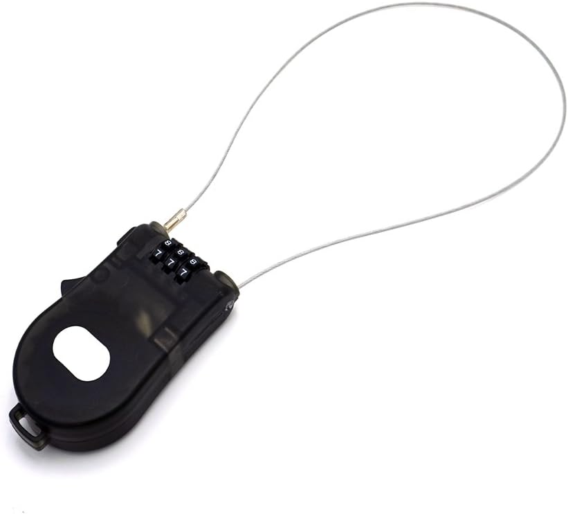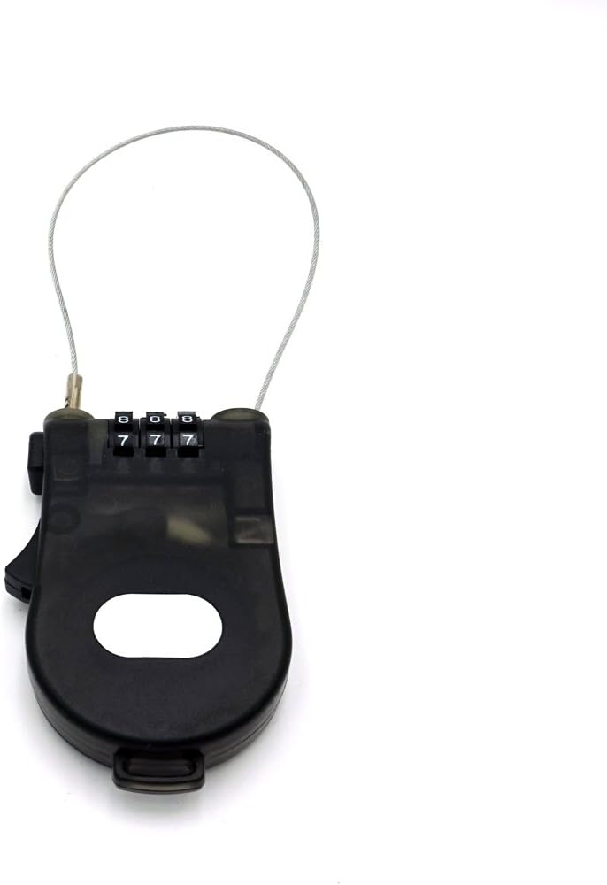 This is a 3-foot (90cm) retractable cable lock. Set your own 3 digit combination. Push button cable retraction for a tight fit around any object. Vinyl coated cable to prevent scratching. Great for sporting goods, briefcases, strollers and backpacks.
