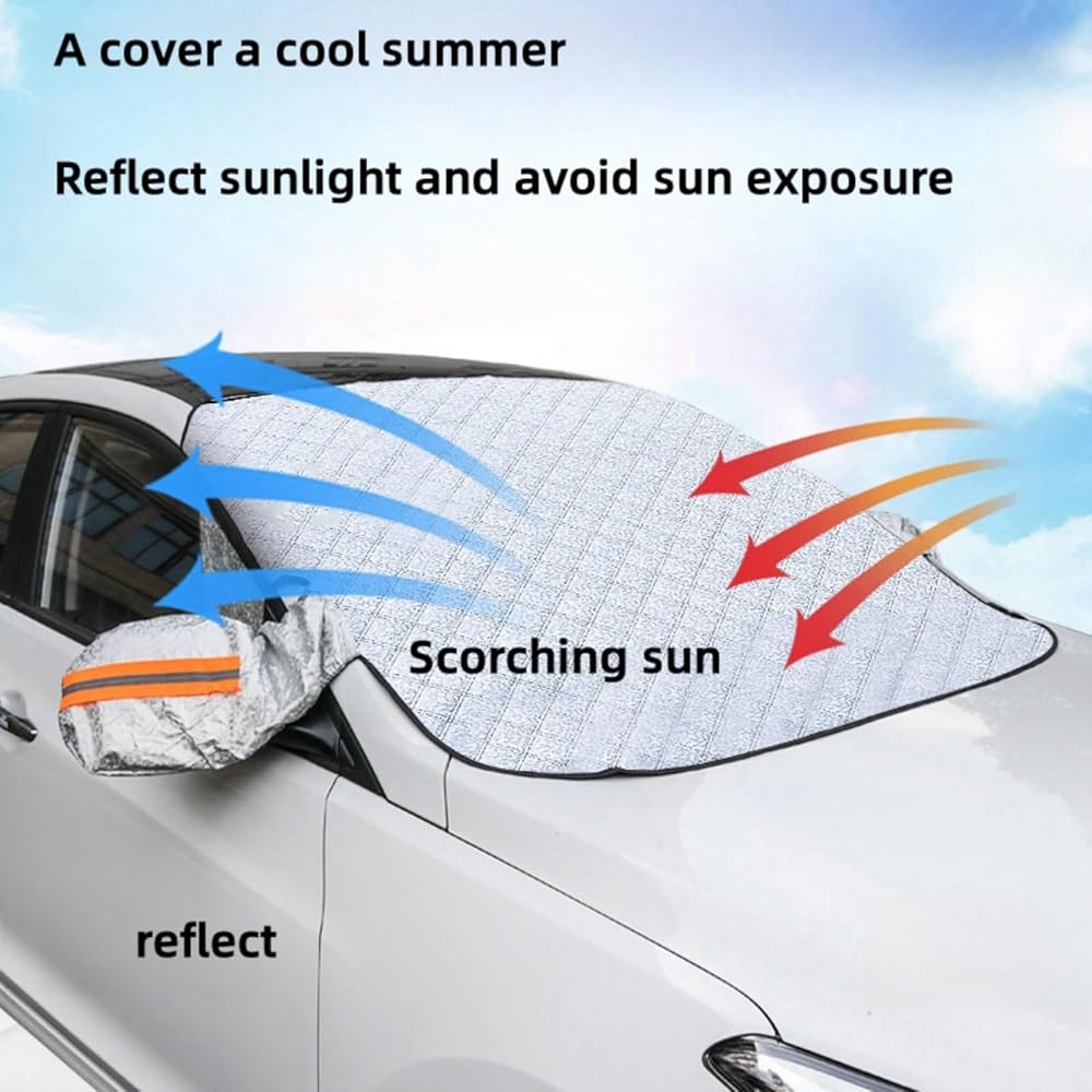 RAIN SHIELD FOR CAR WINDOWS:Versatile vehicle compatibility, the ZCYJHOT front windshield snow cover car cover has a 63 X 46 inch coverage, making it universally compatible with cars, SUVs and more. Magnetic car snow cover with rearview mirror reflective strip, more security.