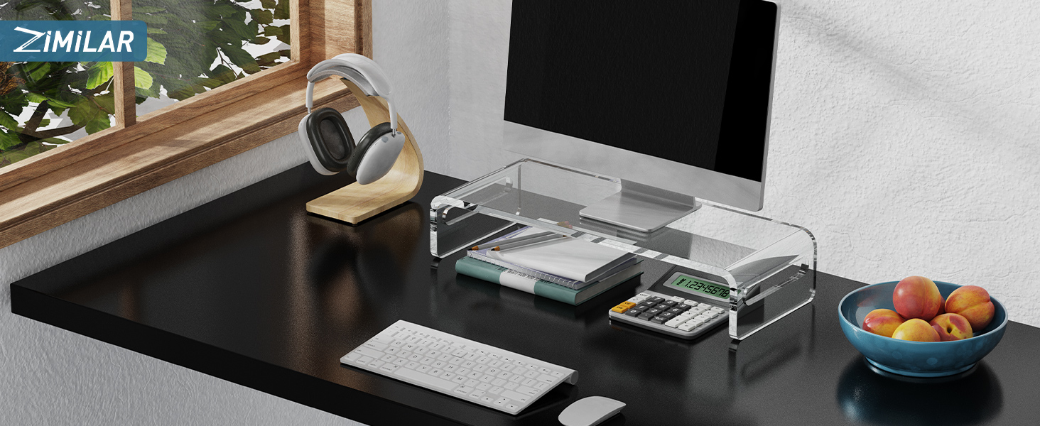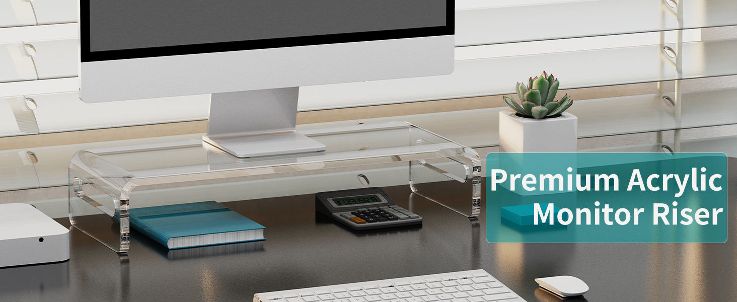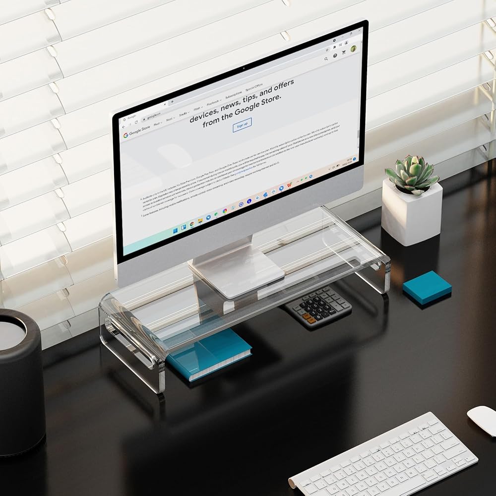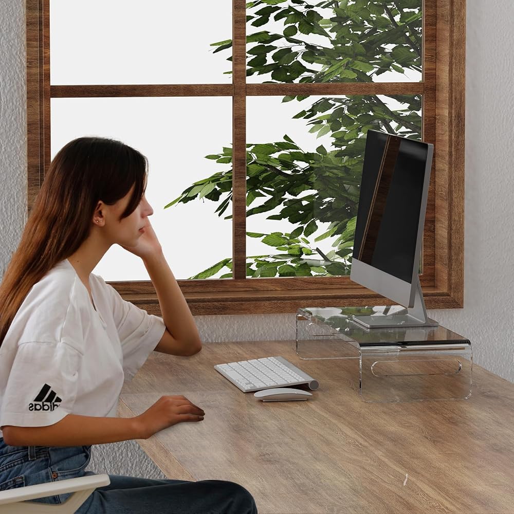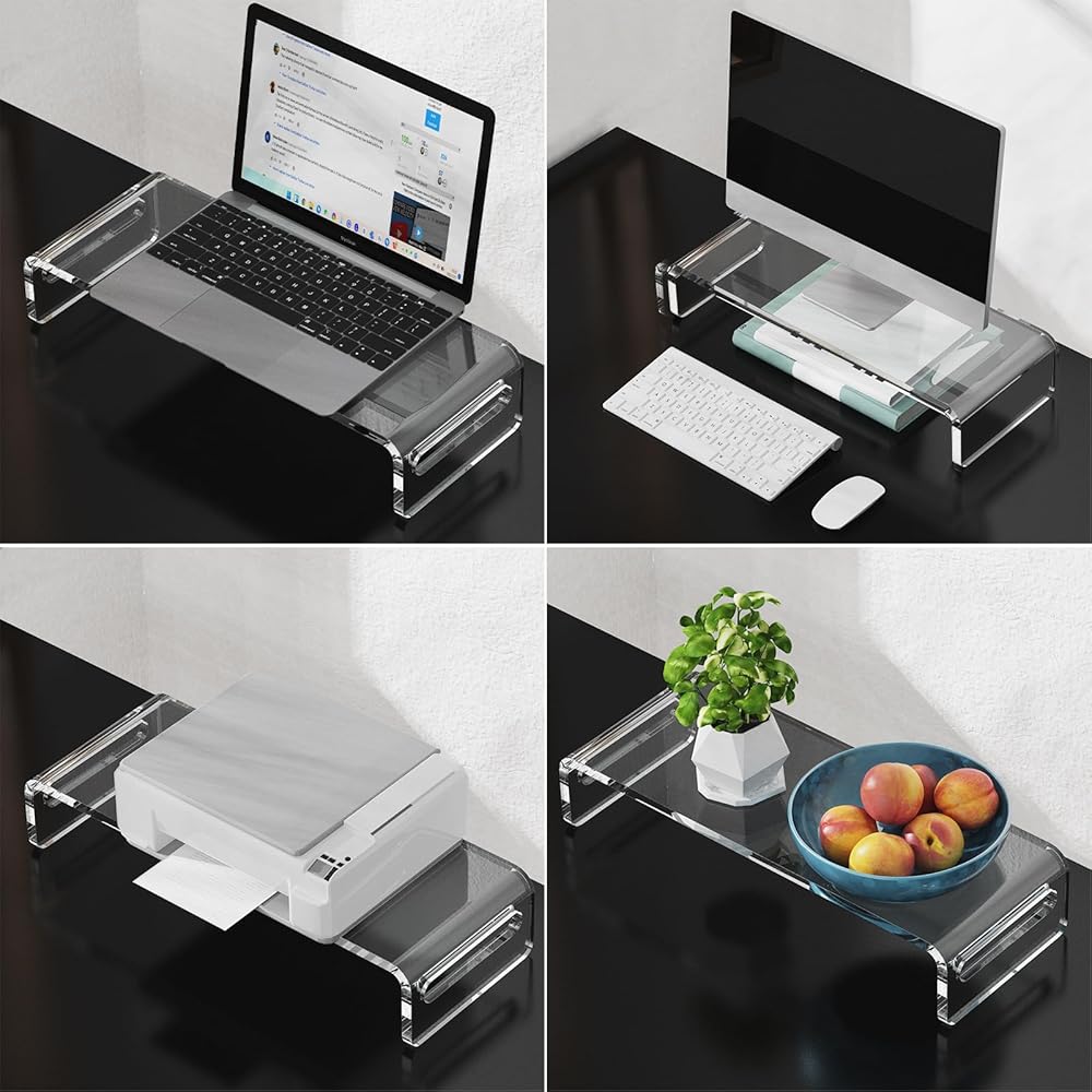 Maximize Desk Space: The open design of this large acrylic monitor stand(20-inch length) allows you to store a keyboard, books, and other essentials underneath, freeing up valuable desktop space.