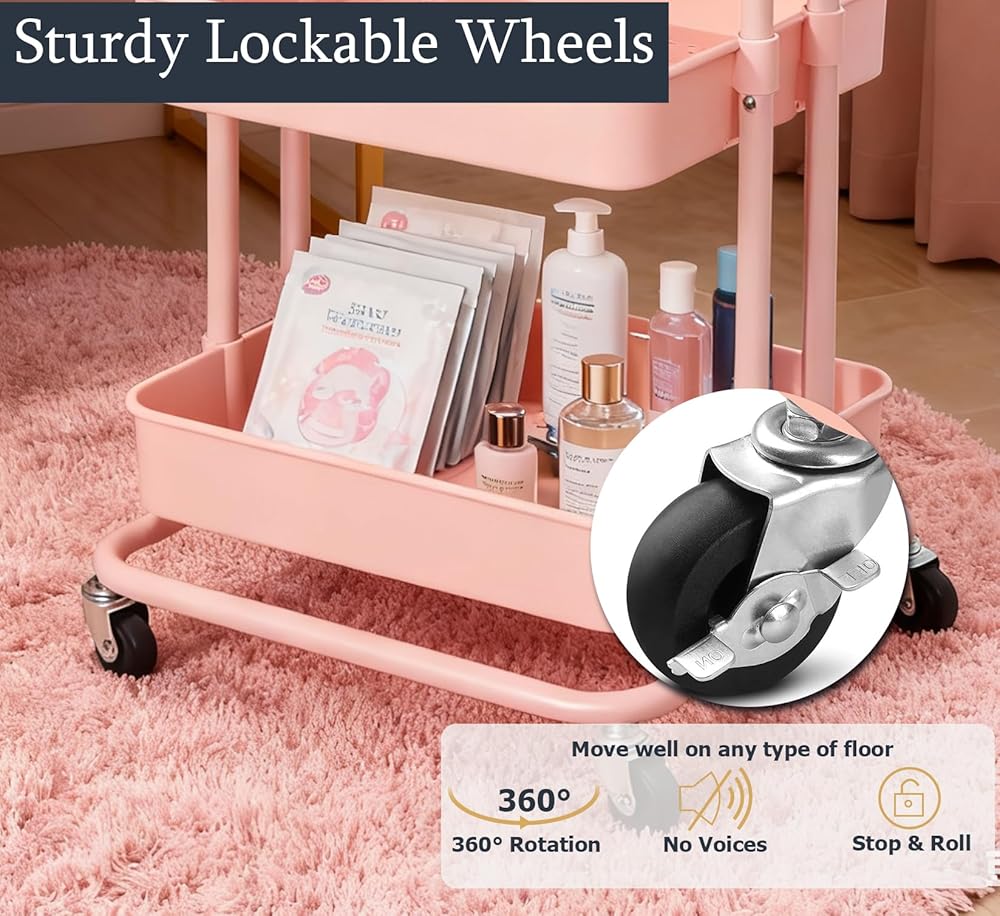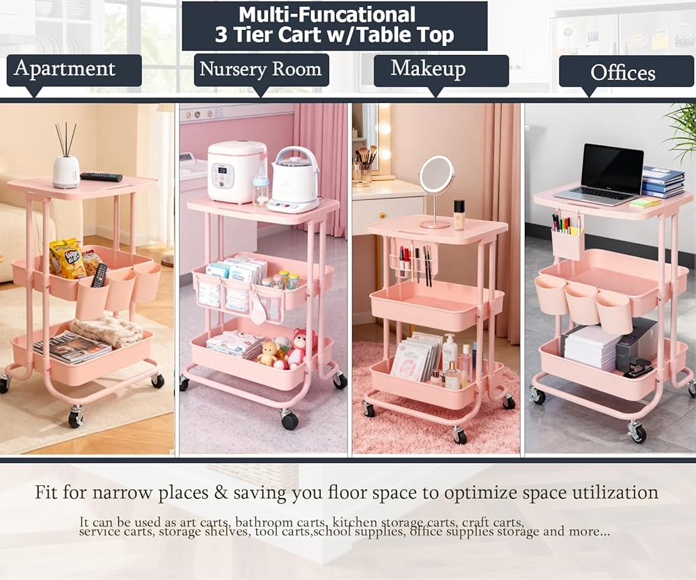 Rolling Cart with Table Top: This upgraded 3 tier rolling cart features with the top layer that is flat surface, you will be able to put your phone/drinks/snacks on the top, and then the makeups/ food/ toys in the baskets, multi-functional rolling shelf cart can be used as a dinner trolley, serving cart, bar cart, baby room cart, organization rack, storage shelves, nightstand and even a 'mobile office