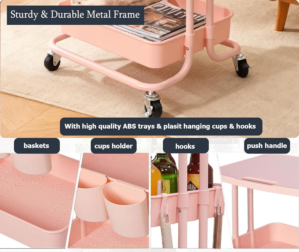 Functional and Flexible Storage Cart: This roller utility cart comes with a METAL frame and QUALITY HARD ABS BASKETS AND TABLE TOP, each tier shelving holds up to 44 lbs for 88 lbs of overall storage shelf, the rolling cart is well-constructed, sturdy, durable to bearing up to totally 200lb, and the ktichen cart comes with 3 HANGING CUPS adds extra storage space