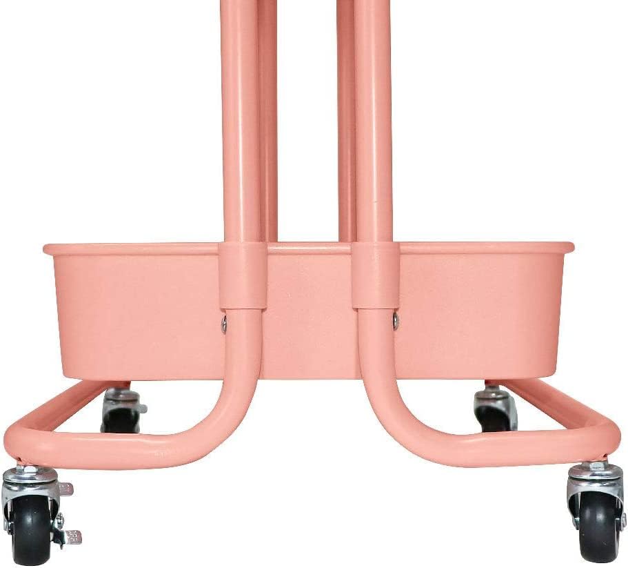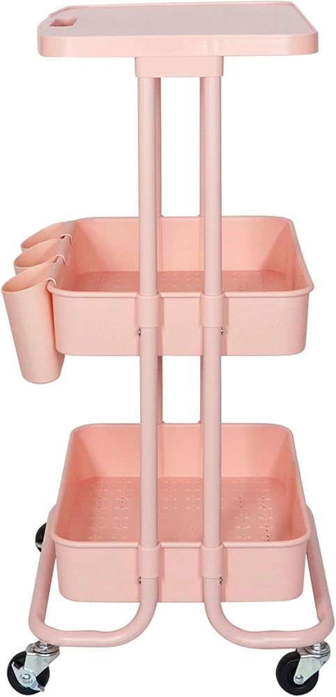 3 Tier Rolling Cart Pink Utility Cart with Table Top Multi-Functional Storage Trolley for Office, Living Room, Kitchen, Movable Storage Organizer on Wheels with Hanging Cups