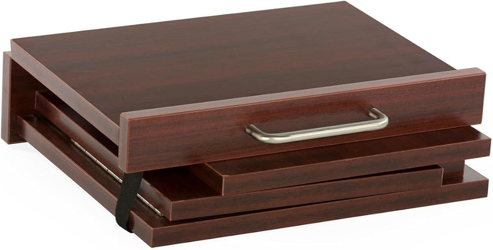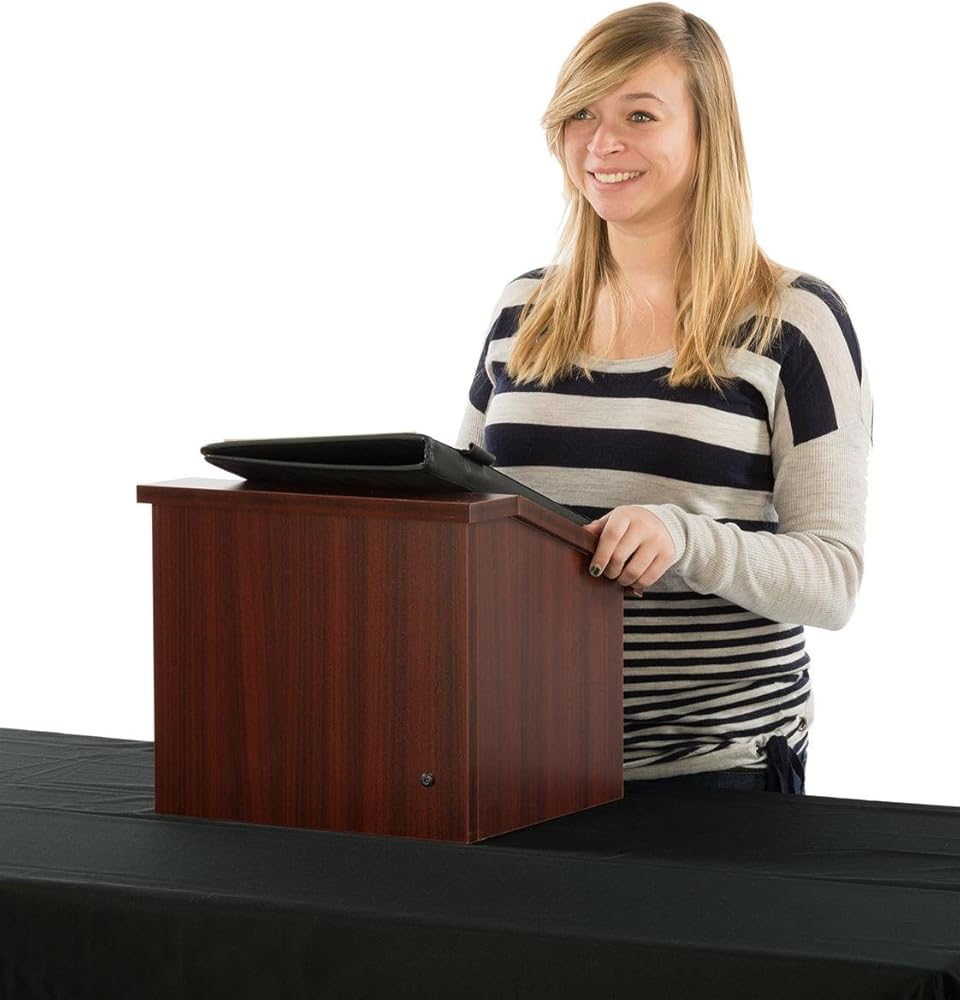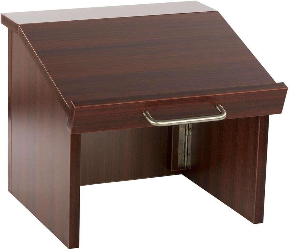 This tabletop podium is for those looking for a lectern that is portable! This podium folds down for mobility, and sets up quickly. Choose from a sleek finish in black, gray, or mahogany. Each podium measures 12.6” tall, with a slanted top surface for reading and speaking. The sturdy 0.5” lip holds binders, books, and papers to prevent them from falling off. The inside of this podium is hollow, which means that it can neatly store water, notes, and other supplies under the podium without distracting guests. In just seconds, this podium folds down for storage and portability, with a carrying handle. These economy podiums are built to last, yet made from plywood with a melamine laminate for affordability. No assembly required! Overall dimensions: 14.6”W x 12.6”H x 14”D. Collapsed dimensions: 14.6”W x 5”H x 12.6”D. Top surface dimensions: 14.6”W x 13.5”D. Weight: 12 lbs.