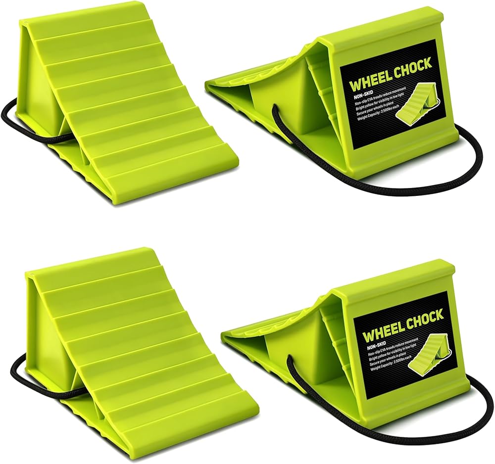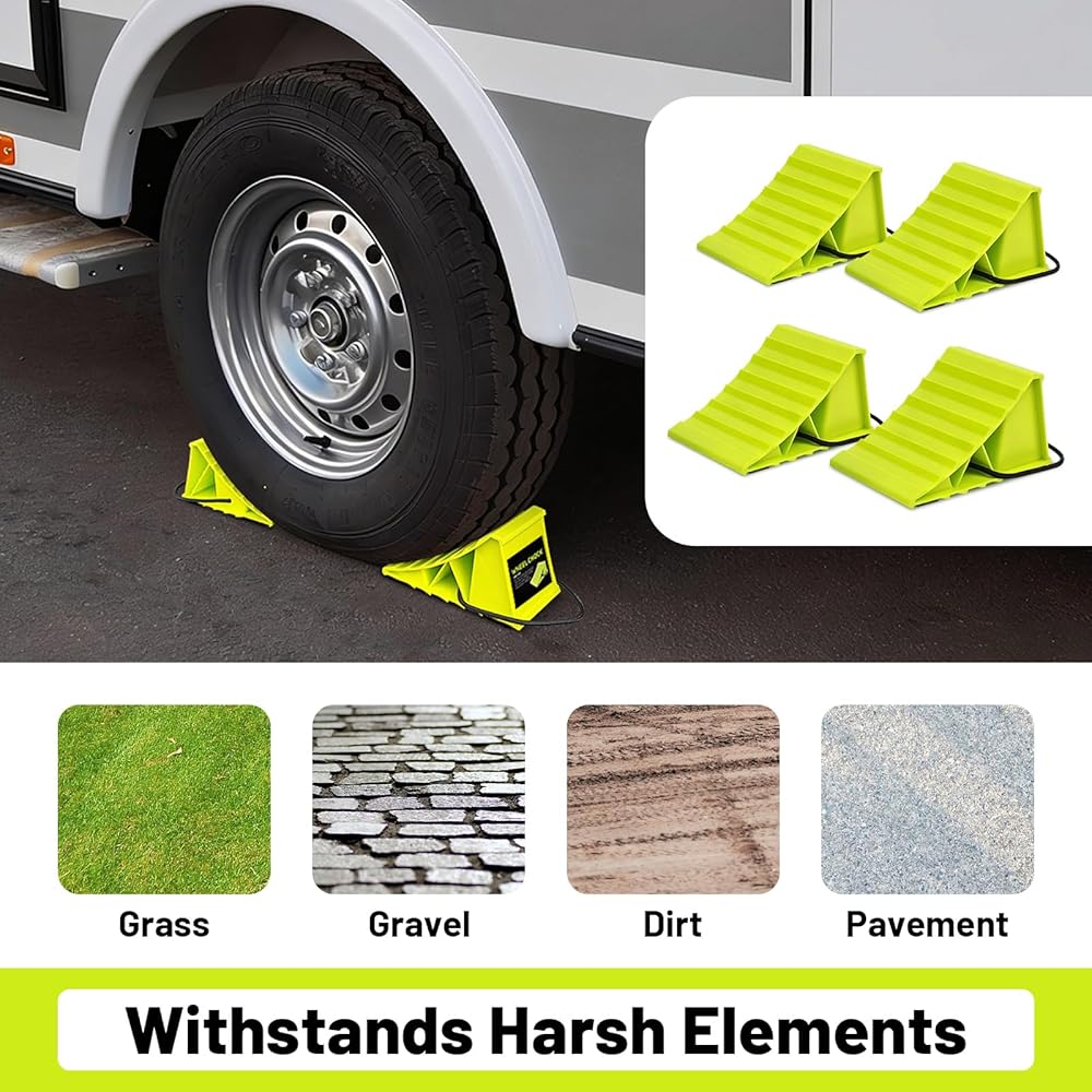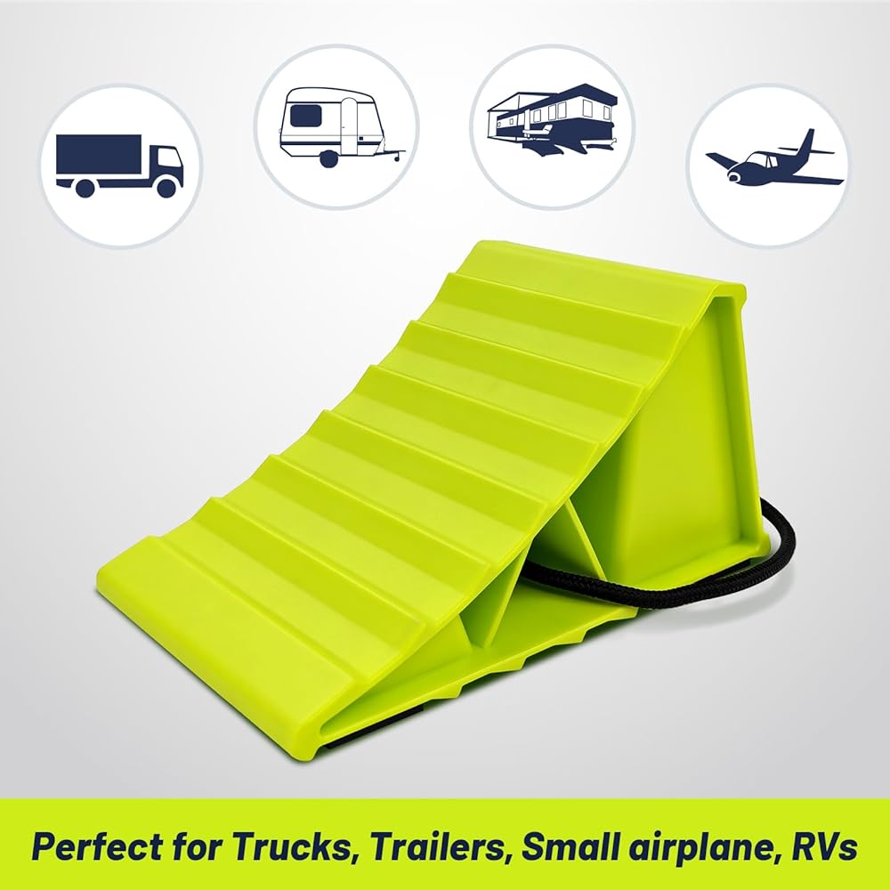 ROBLOCK 4 Pairs Wheel Chocks for Travel Trailers, Non Slip Base Heavy Duty Green Camper Wheel Chockwith Rope, Lightweight Wheel Stoppers for Cars, Camper Trucks, RVs, Easy to Carry, Green
