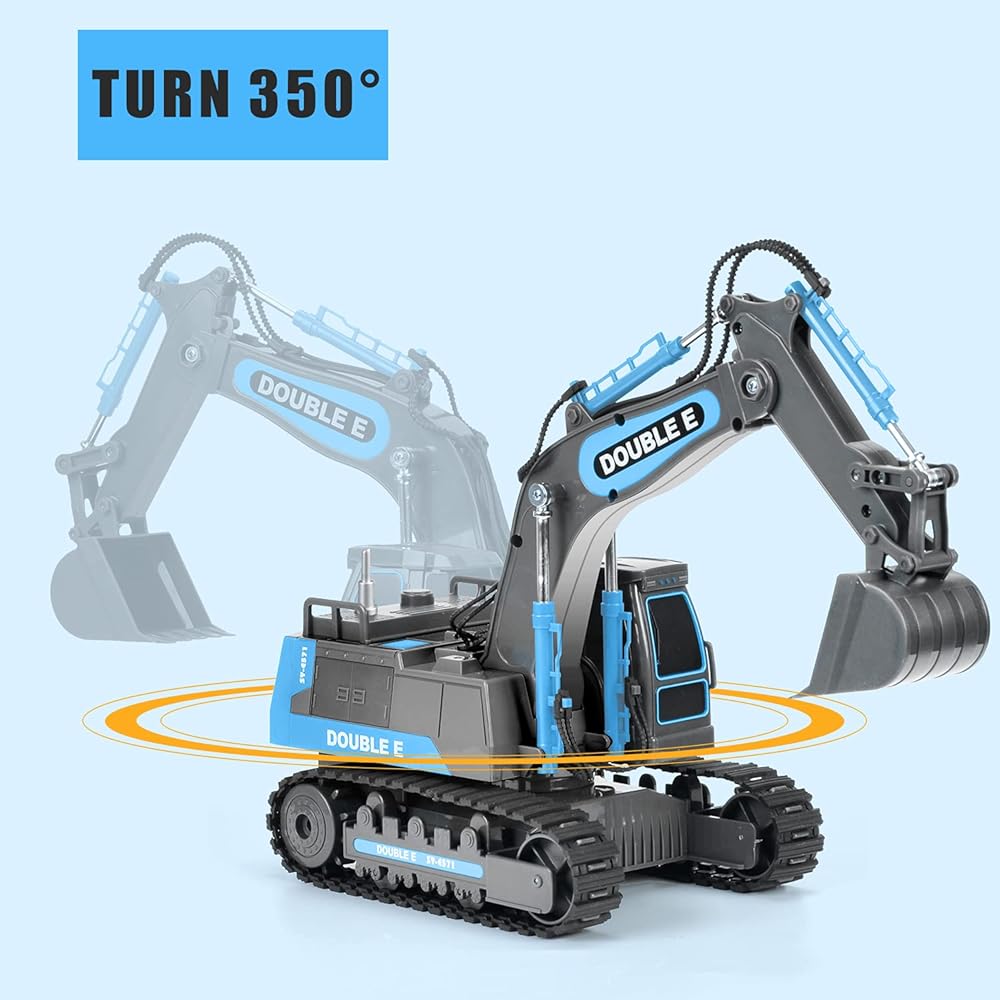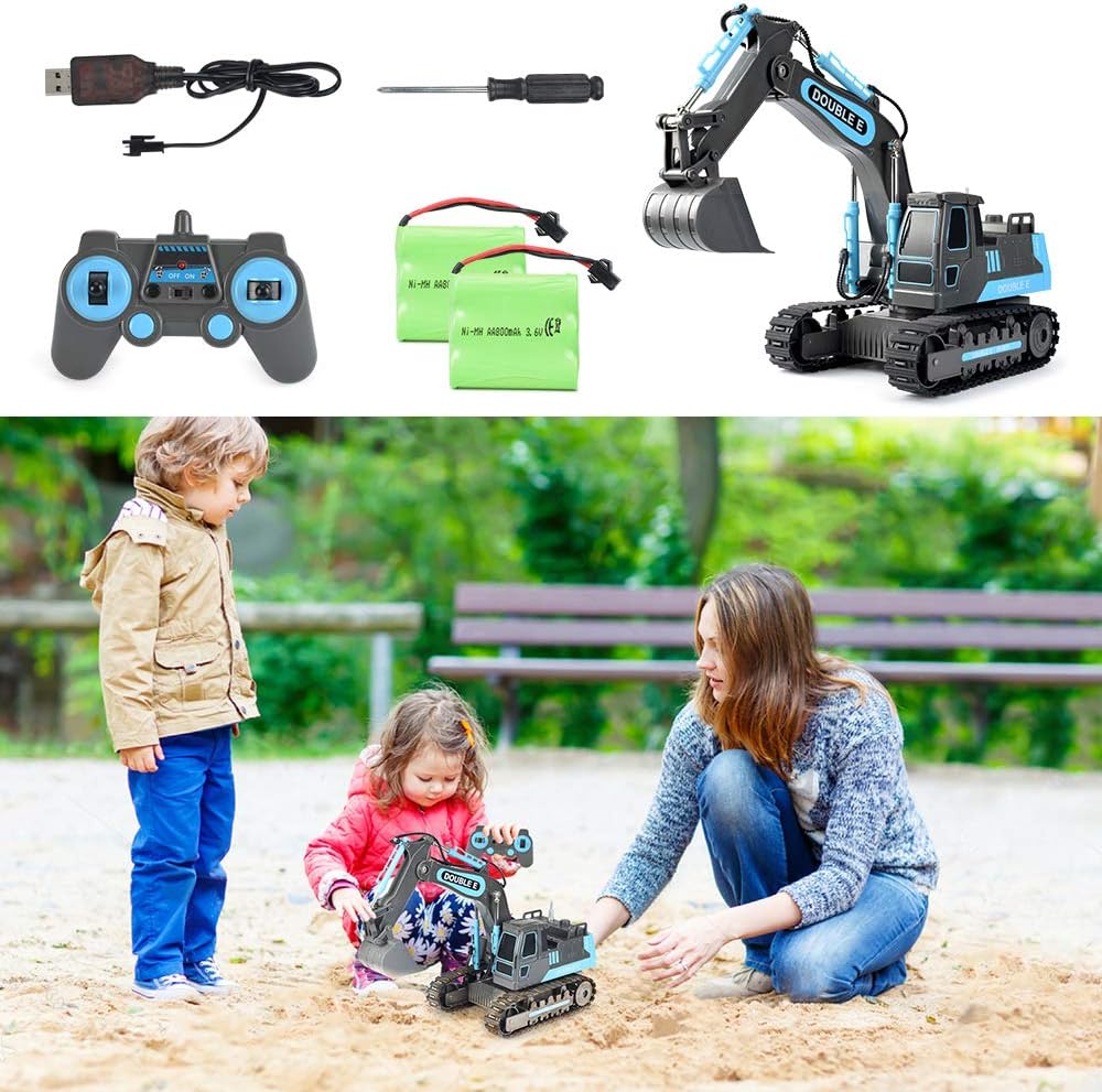 DOUBLE E Remote Control Excavator Toy RC Excavators Rechargeable Battery Digger Hydraulic Construction Toys Vehicles Xmas Gift for Boys Girls Kids 3-14 Years,Gray-Blue