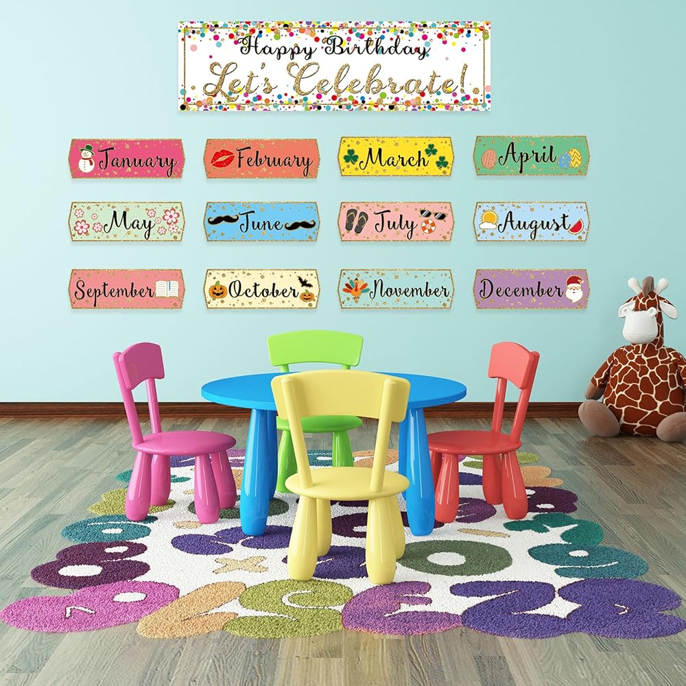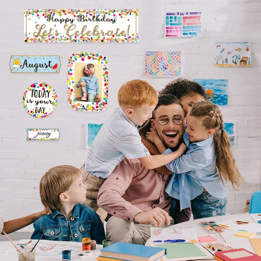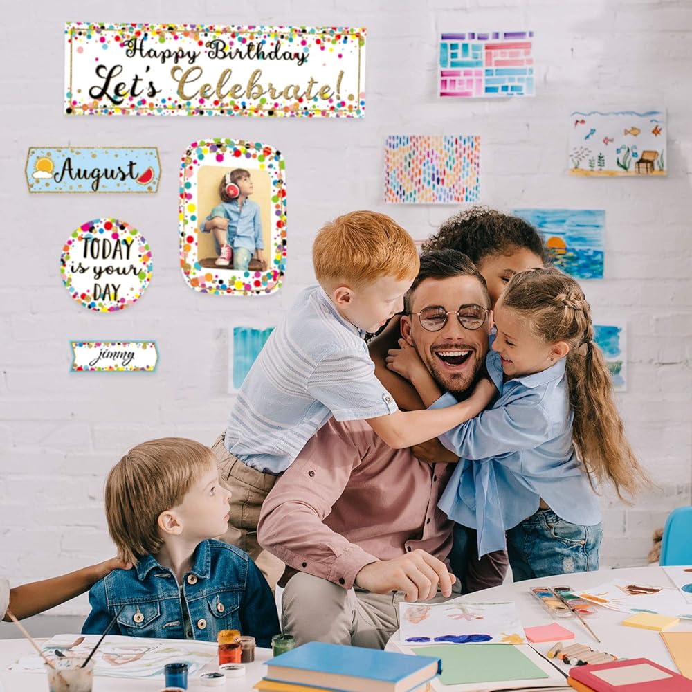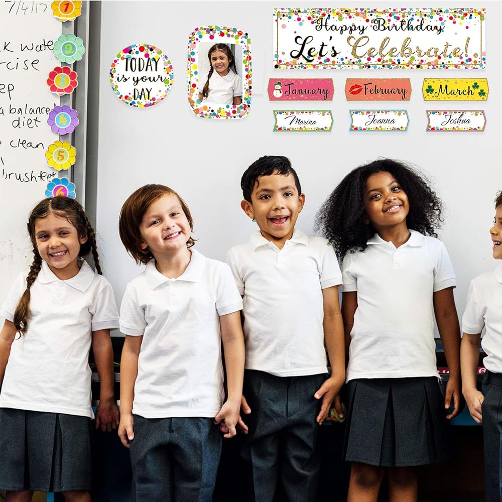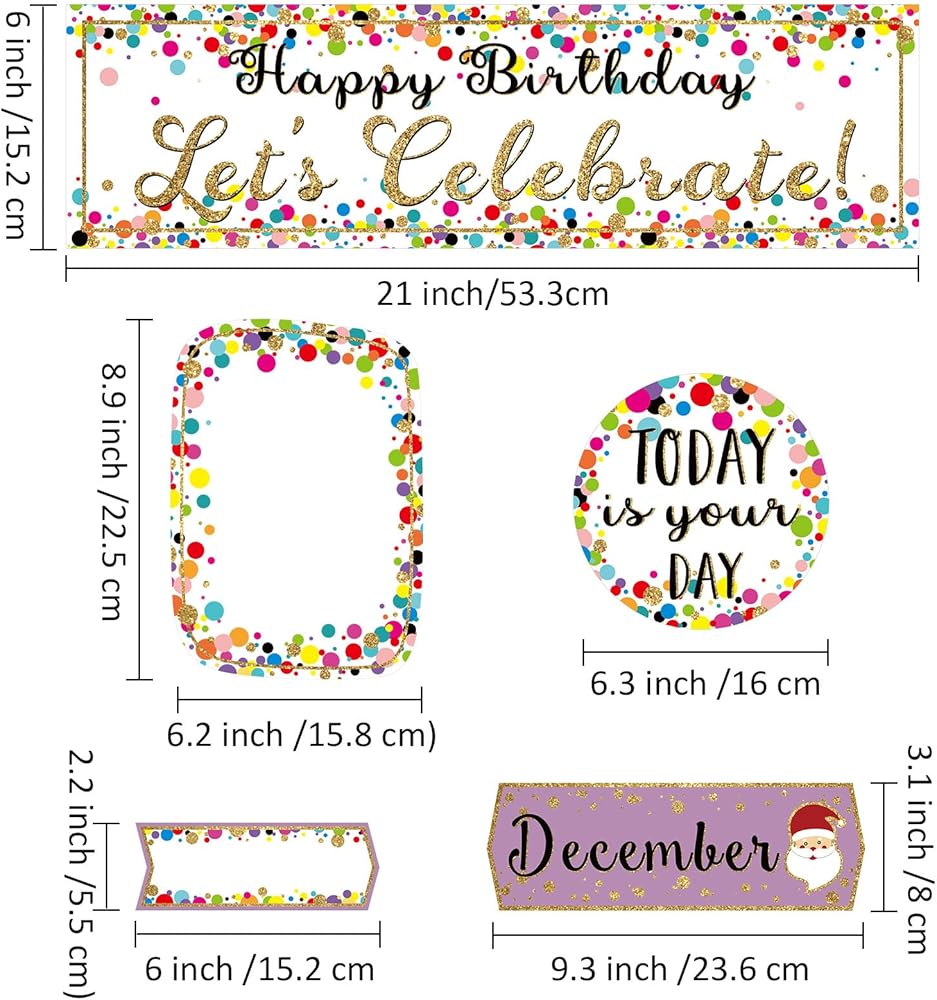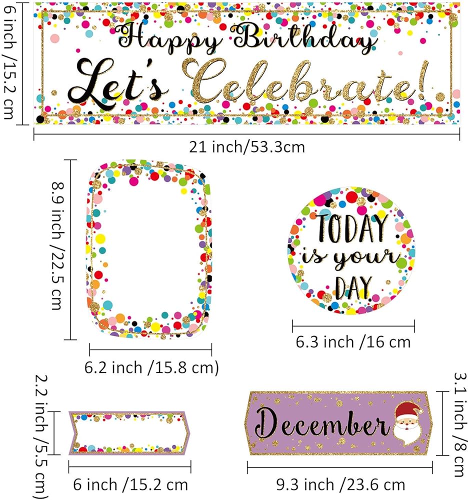 Suitable size: "Happy Birthday Let's Celebrate" title measures 21 x 6 inch (53.3 x 15.2 cm); Monthly headers measure 9.3 x 3.1 inch (23.6 x 8 cm); Picture frame measures 6.2 x 8.9 inch (15.8 x 22.5 cm); "Today is your Day" sign measures 6.3 inch (16 cm) in diameter; Colorful labels for student names measure 6 x 2.2 inch (15.2 x 5.5 cm); Large enough to get the students' attention