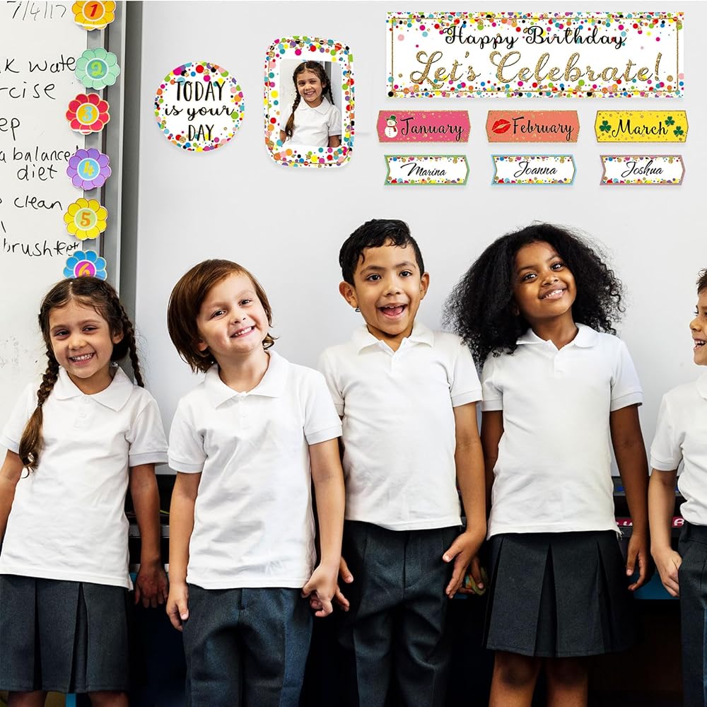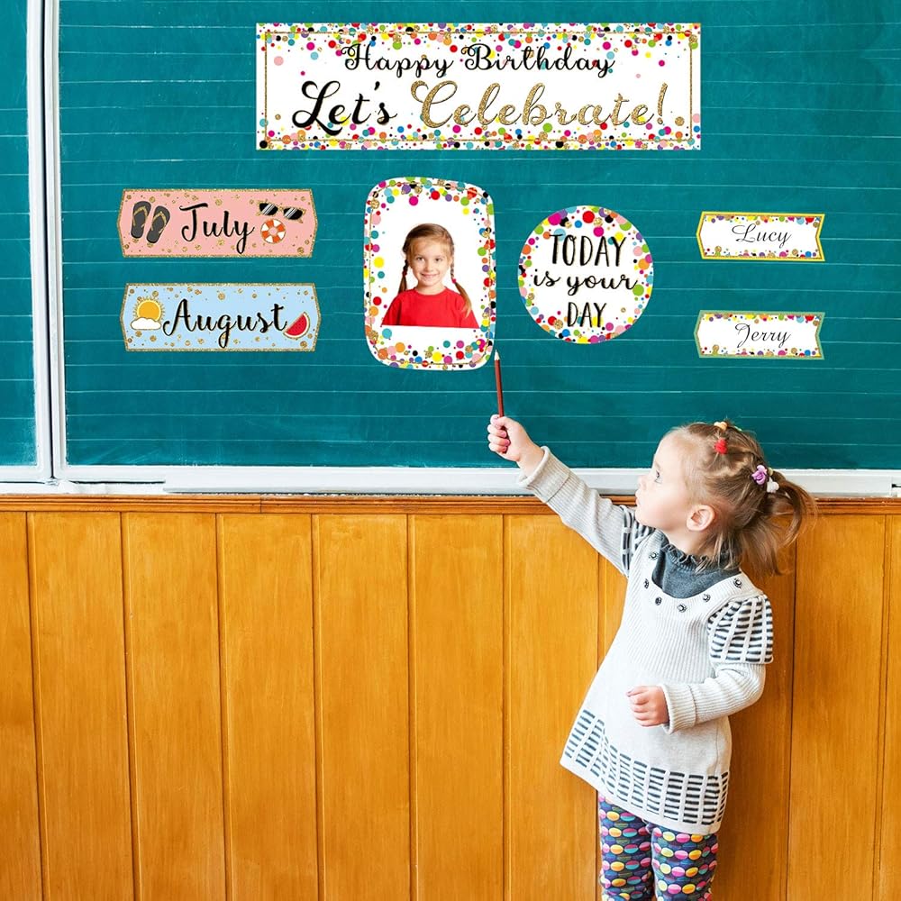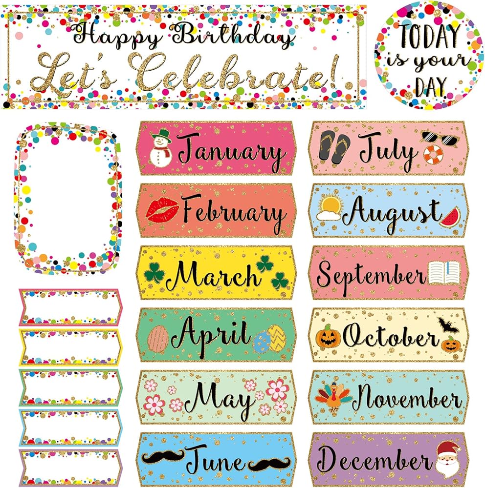 What you will get: comes with 1 "Happy Birthday Let's Celebrate" title piece, 12 monthly headers, 1 "Today is your Day" sign, 1 picture frame, 45 colorful labels for student names and 120 adhesive point dots; It's a great decorative solution for personalizing year-round birthday charts
