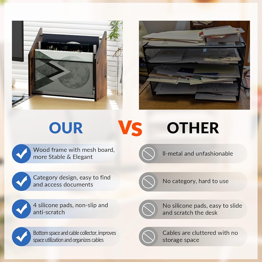 【PERFECT SPACE UTILIZATION】VERY USEFUL ARRANGEMENT, NO WASTED SPACE. Our paper organizer use of 3-tier vertical space, the bottom of the socket cable space and on-demand cable management, the original cluttered desktop into a well-organized, truly realize the ideal of small space and large storage.