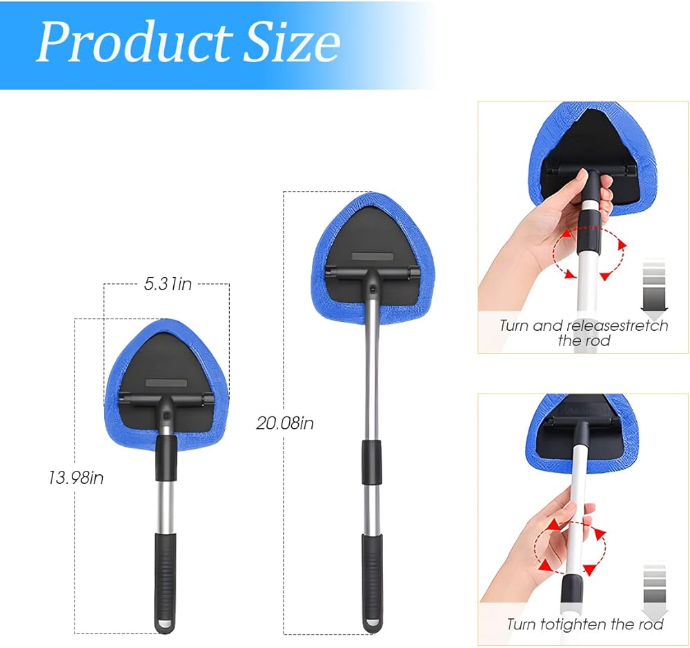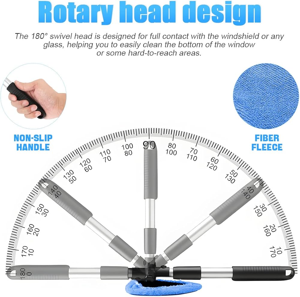 【Expandable & Rotatable】: The windshield cleaner is designed with an extra-long extended handle and 180 degree rotating head, which allows it to fully reach all surfaces and you can clean those hard-to-reach areas effortlessly. It easily removes debris from the corners of the windshield and is ideal for cleaning the interior and exterior of your car.
