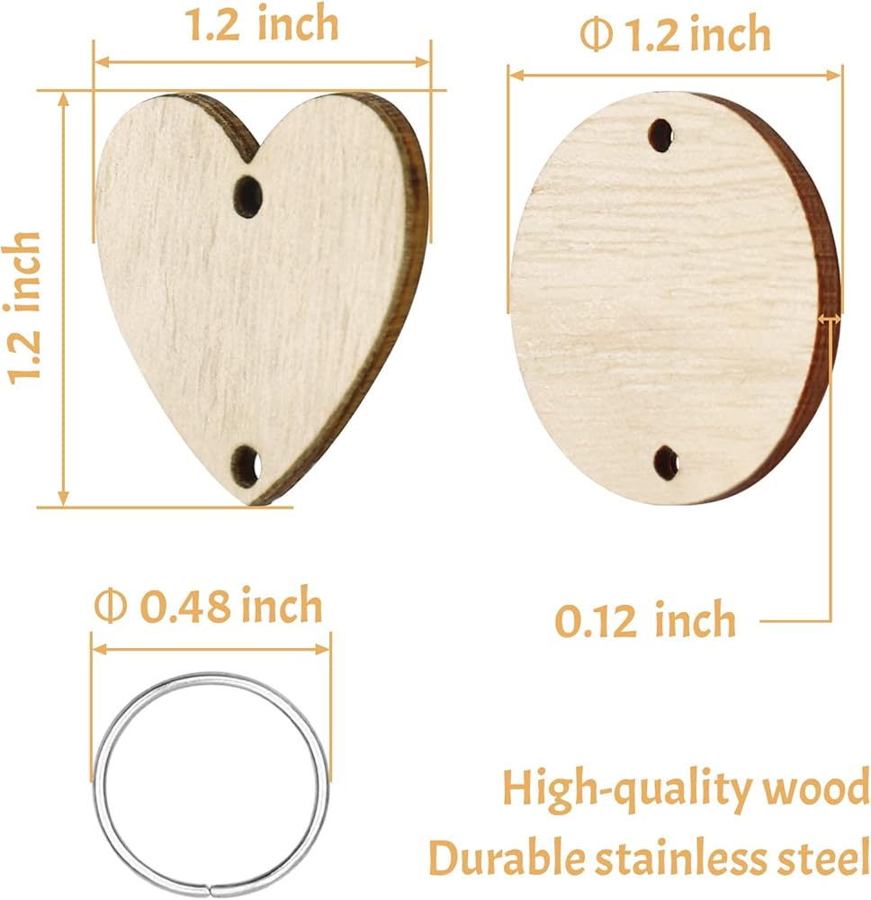 Appropriate size: The diameter of each round label is 30 mm/ 1.2 inches, the length and width of each heart label is 30 x 30 mm/ 1.2 x 1.2 inches, all labels with 2 holes is 3 mm/ 1.2 inches thick. And the key rings measure 12 mm/ 0.48 inch in diameter,which makes it easy for you to string together the tags to decorate the craft you want.