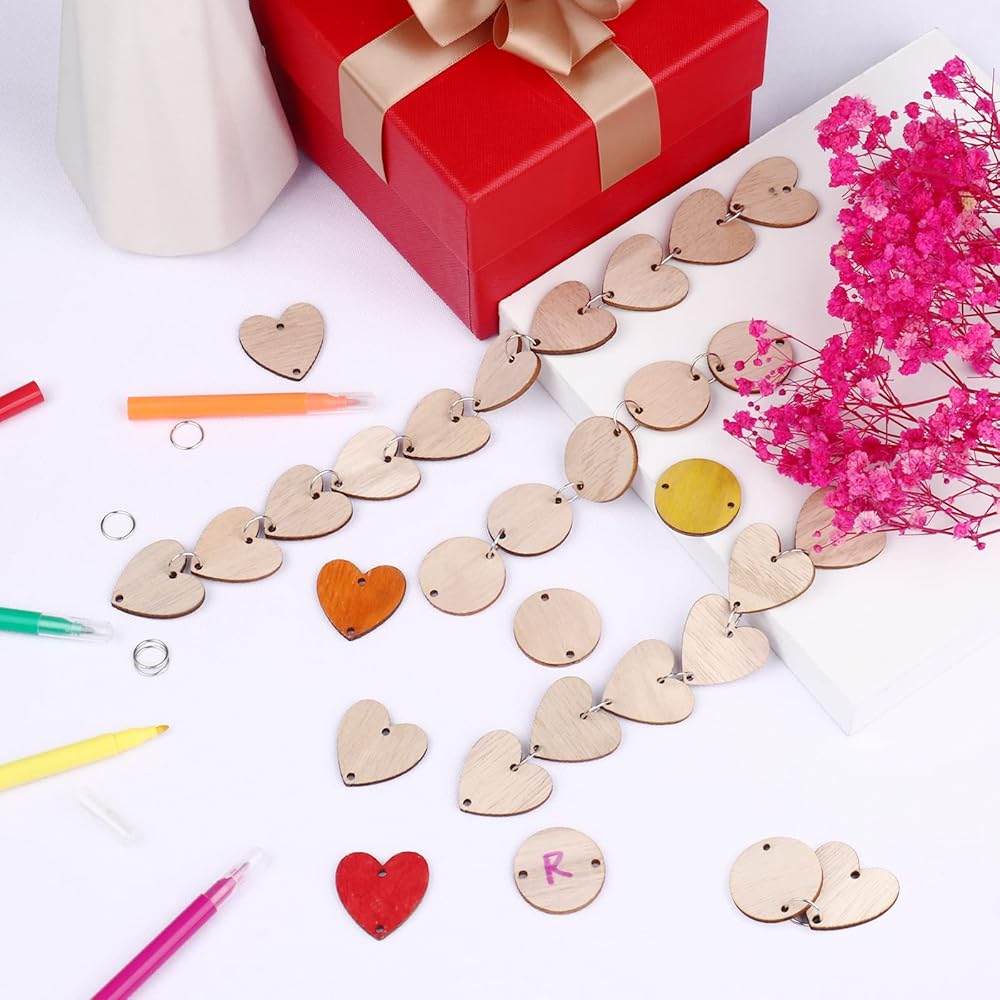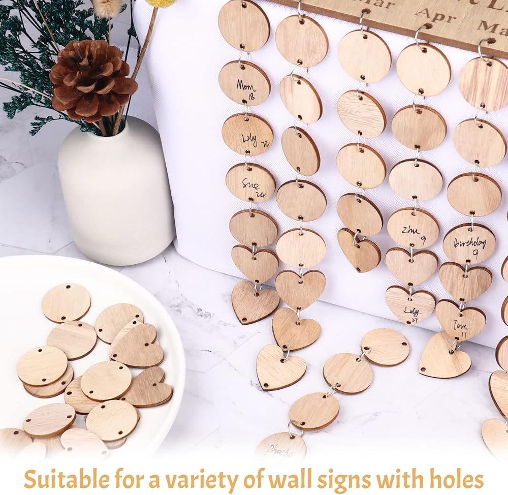 200 Pieces in Total Wooden Circles Wooden Heart Tags with Holes,Wood Craft Set with Holes and Ring Clips for Birthday Board, Valentine, Chore Boards, Arts and Crafts Tags (200 Pieces)