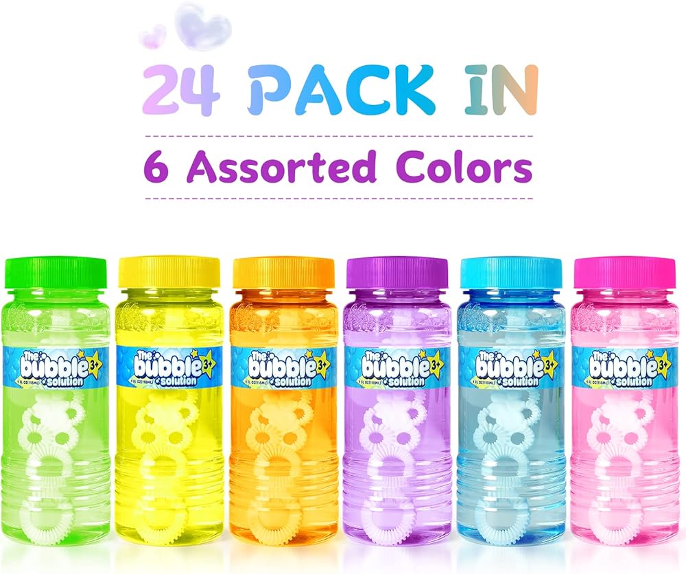 Super Value Package:Our kids bubbles bulk includes a total of 24 bubble bottles. Each comes with 4oz solution and a bubble wand that can blow a beautiful series of bubbles. These come in 6 lovely bright colors (purple, green, pink, orange, blue and yellow), which is great to be party favors.