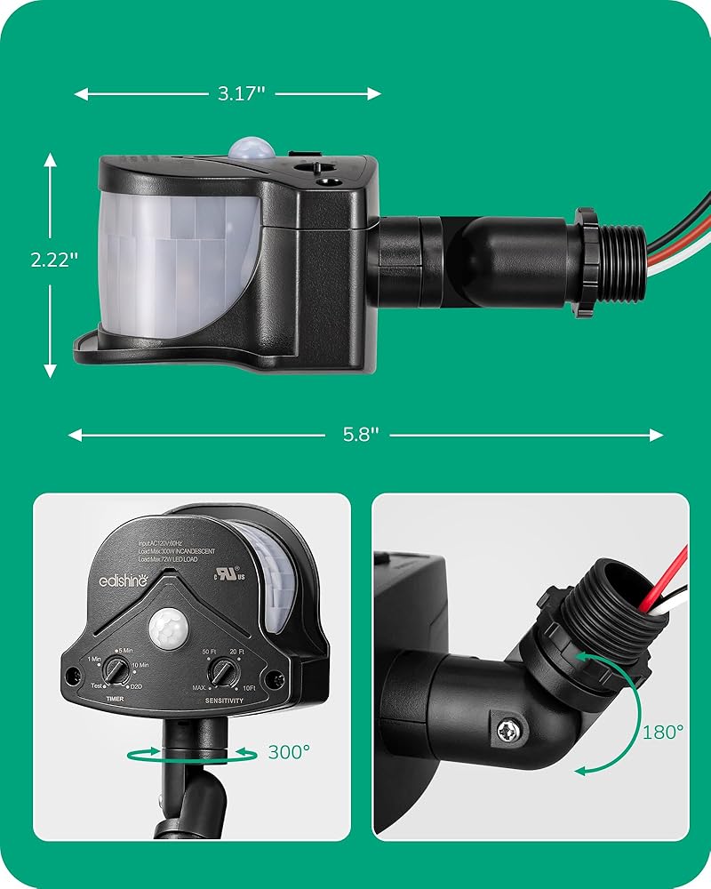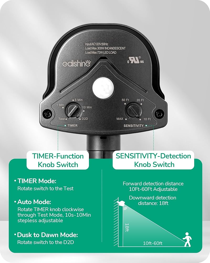 EDISHINE 240° & 360° Motion Sensor, Replacement Motion Detector for Outdoor Lights, Adjustable Time & Detection Range Up to 60FT, 3 Modes PIR Motion Sensor for Floodlight, Black, UL Listed